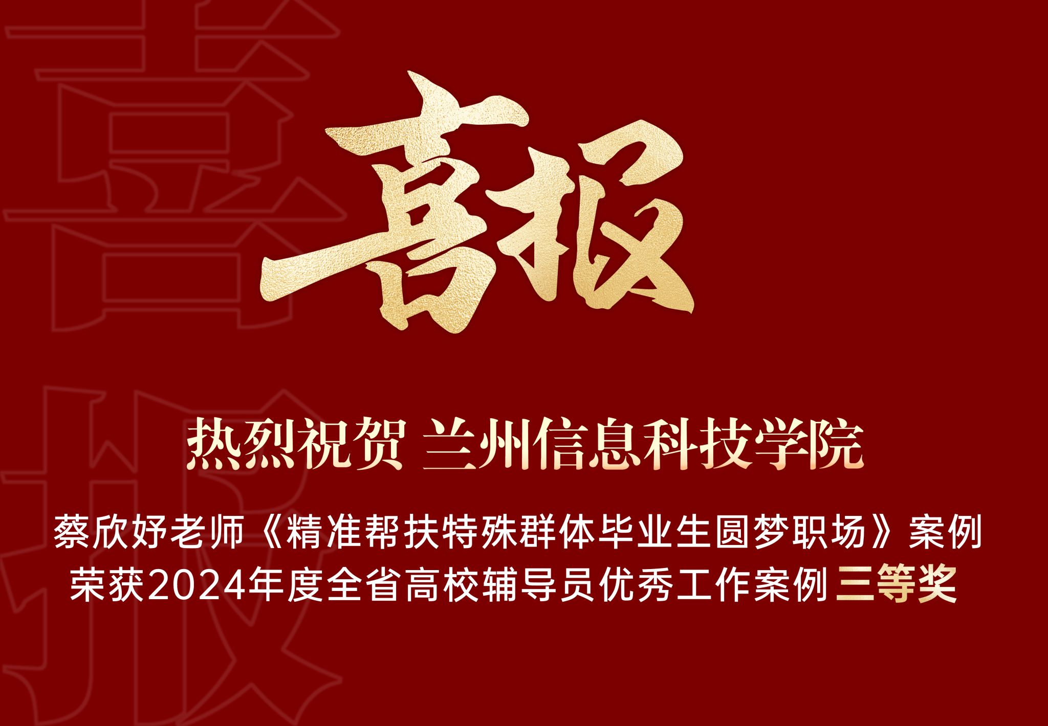 此次全省高校辅导员优秀工作案例征集评选活动由甘肃省委教育工委、省教育厅思想政治工作处统筹指导,教育部高校思想政治工作队伍培训研修中心(西北师范大学)组织开展,共收集到辅导员优秀工作案例138篇,经个人申报、单位推荐、专家评审等环节,共评选出12个一等奖、18 个二等奖、30个三等奖予以表彰。开元集团网站蔡欣妤老师撰写的《精准帮扶特殊群体毕业生圆梦职场》获得三等奖。