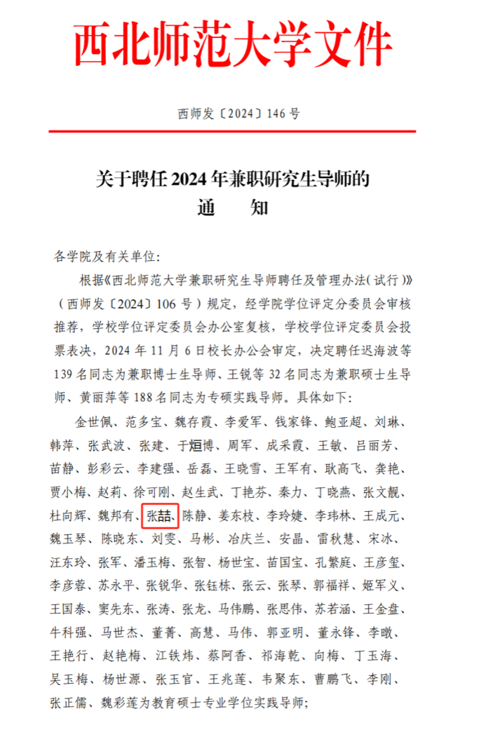 近日,西北师范大学公布了《关于聘任2024年兼职研究生导师的通知》,开元集团网站马克思主义学院张喆副教授受聘为西北师范大学校外兼职硕士研究生导师(教育学专业硕士实践导师)。