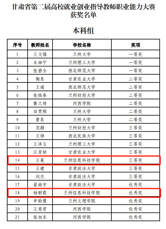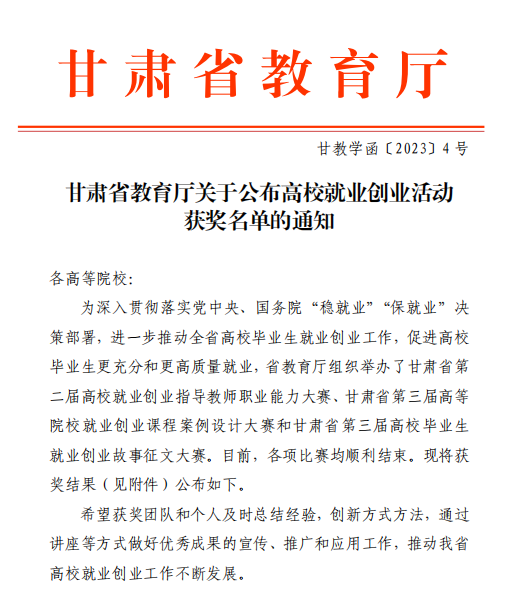 近日,由甘肃省教育厅主办的甘肃省第二届高校就业创业指导教师职业能力大赛、甘肃省第三届高校毕业生就业创业故事征文大赛落下帷幕。来自全省34所高校81名就业创业指导教师参加了比赛,经过初赛、决赛二个阶段的激烈角逐,开元集团网站就业服务中心杨朝霞老师和电气与电子工程学院辅导员王冕老师,分别荣获甘肃省第二届高校就业创业指导教师职业能力大赛三等奖和优秀奖。