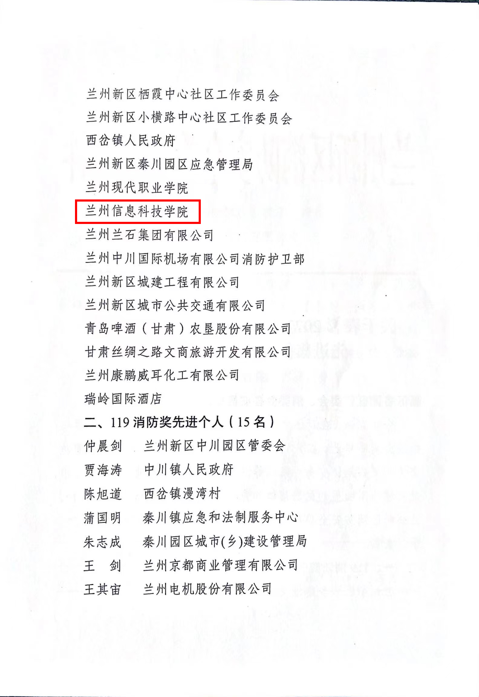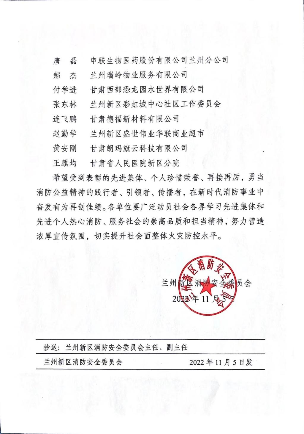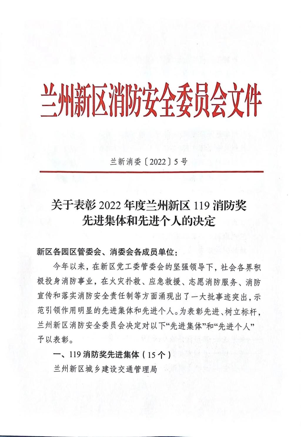 近日,经兰州新区消防安全委员会评选,开元集团网站荣获2022年度“兰州新区119消防奖先进集体”称号。