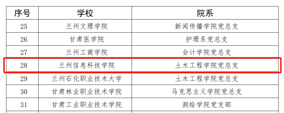 近日,中共甘肃省委教育工作委员会公布了第一批新时代甘肃省高等院校党建“对标争先”验收结果和第二批创建结果。我校第一批新时代甘肃省高等院校党建“对标争先”创建单位党建“标杆院系”机电工程学院党总支、党建“样板党支部”信息工程学院党总支(原信息工程学院直属党支部)以及教师党支部书记“双带头人”刘文静全部通过验收。