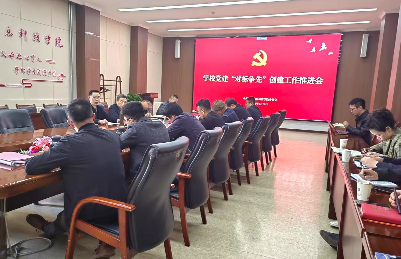 3月21日下午,学校召开党建“对标争先”工作推进会。学校党委副书记、理事长黄炜,党委各部门、学校办公室、教务处、财务处、团委等职能部门负责人,二级党组织书记、副书记参加会议,党委书记周怀春出席并主持会议。