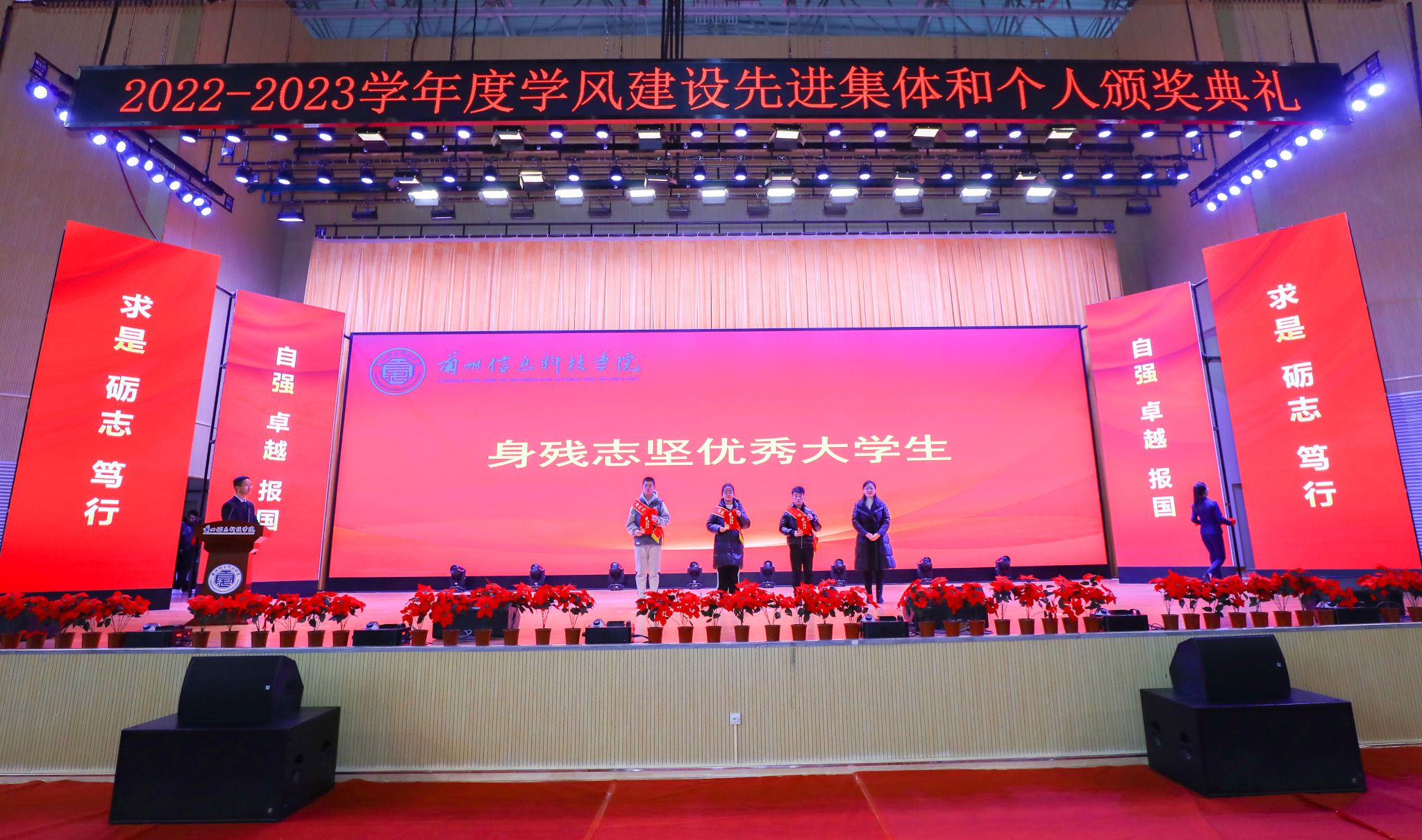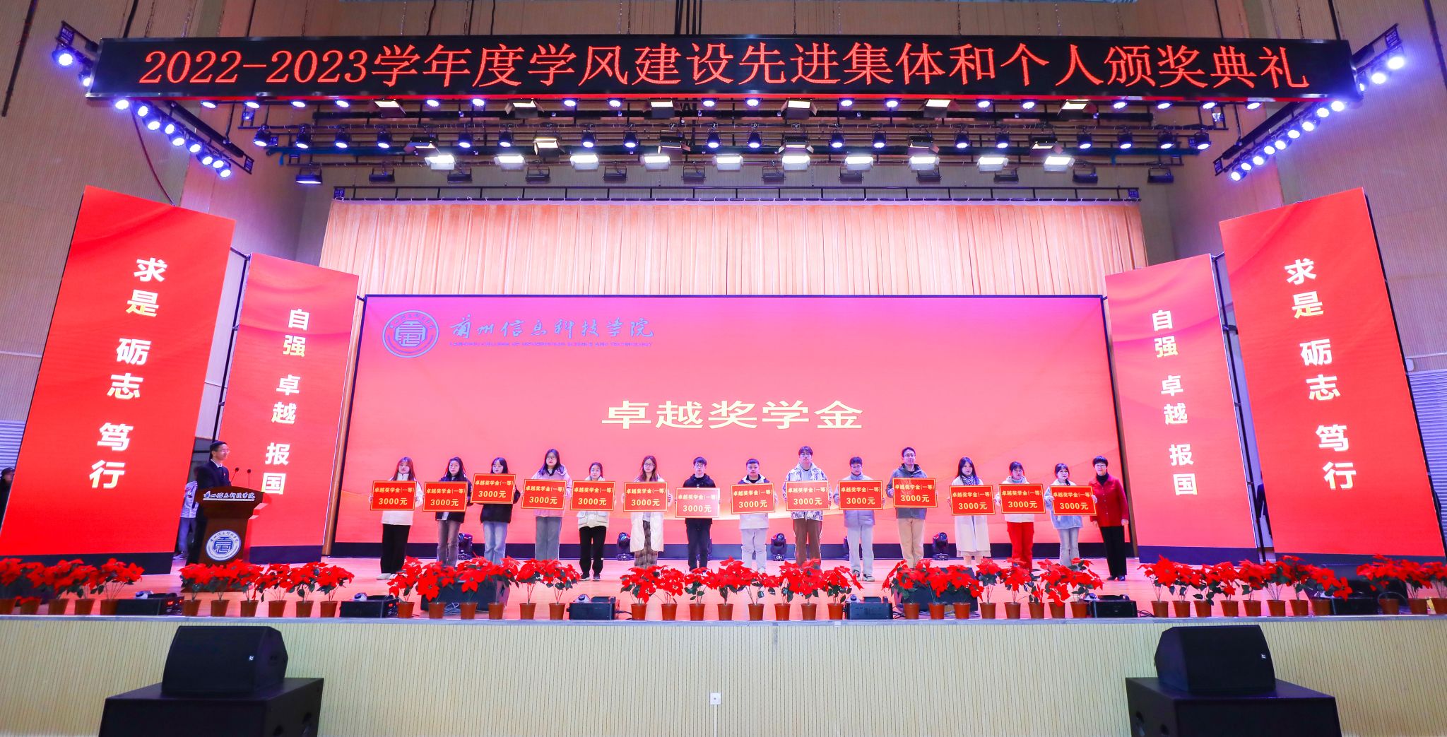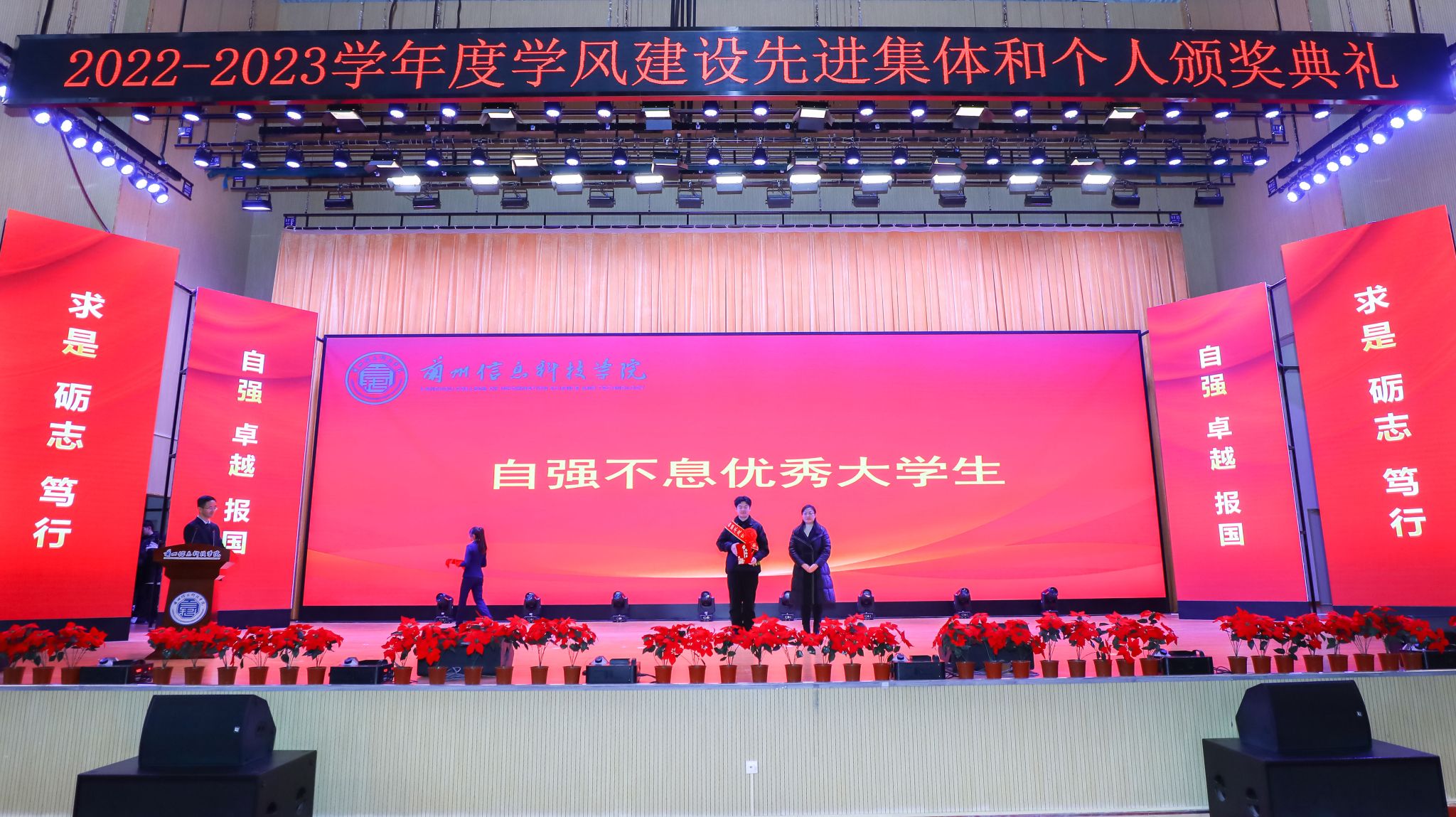 颁奖典礼在庄严的中华人民共和国国歌声中拉开帷幕。大会分别宣读了《关于表彰2022-2023学年学生评奖评优获奖集体和个人的决定》《关于表彰2022-2023学年“宿舍文明建设工程先进集体”“学风建设标兵宿舍”“文明宿舍”“卫生先进宿舍”的决定》《关于表彰20周年校庆“优秀志愿者”“优秀演员”的决定》《关于授予赵雅琪等3名同学“勤奋好学优秀大学生”荣誉称号的决定》《关于授予陈鑫等26名同学“科技创新优秀大学生”荣誉称号的决定》《关于授予高翔同学“见义勇为优秀大学生”荣誉称号的决定》《关于授予班海翔、李鑫2名同学“助人为乐优秀大学生”荣誉称号的决定》《关于授予丁昊等5名同学“身残志坚优秀大学生”荣誉称号的决定》《关于授予马成龙同学“自强不息优秀大学生”荣誉称号的决定》《关于授予彭程等50名同学“参军报国优秀大学生”荣誉称号的决定》文件,并现场为每项获奖集体和个人分别宣读了颁奖词,与会校领导为获奖集体与个人颁奖。