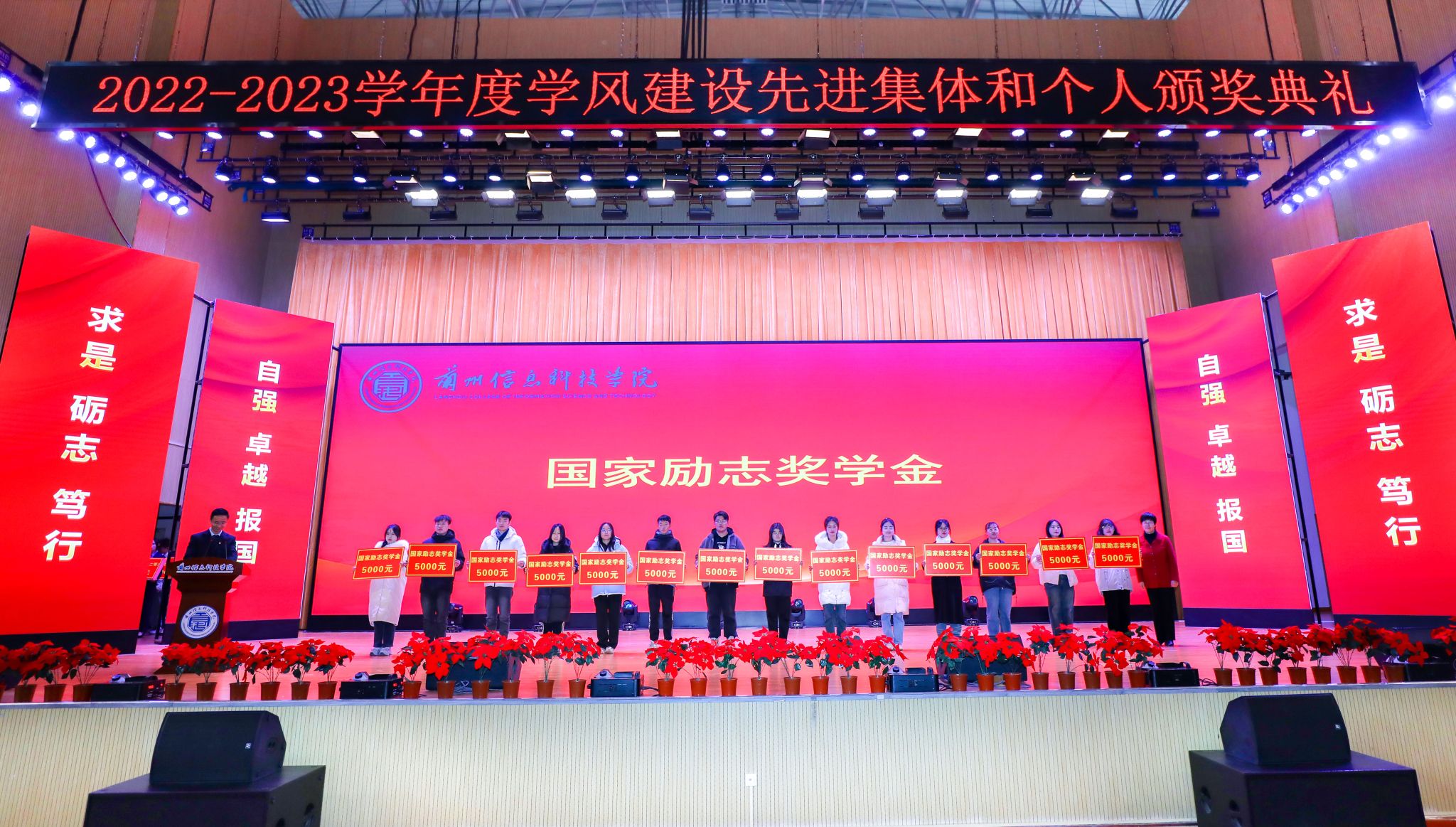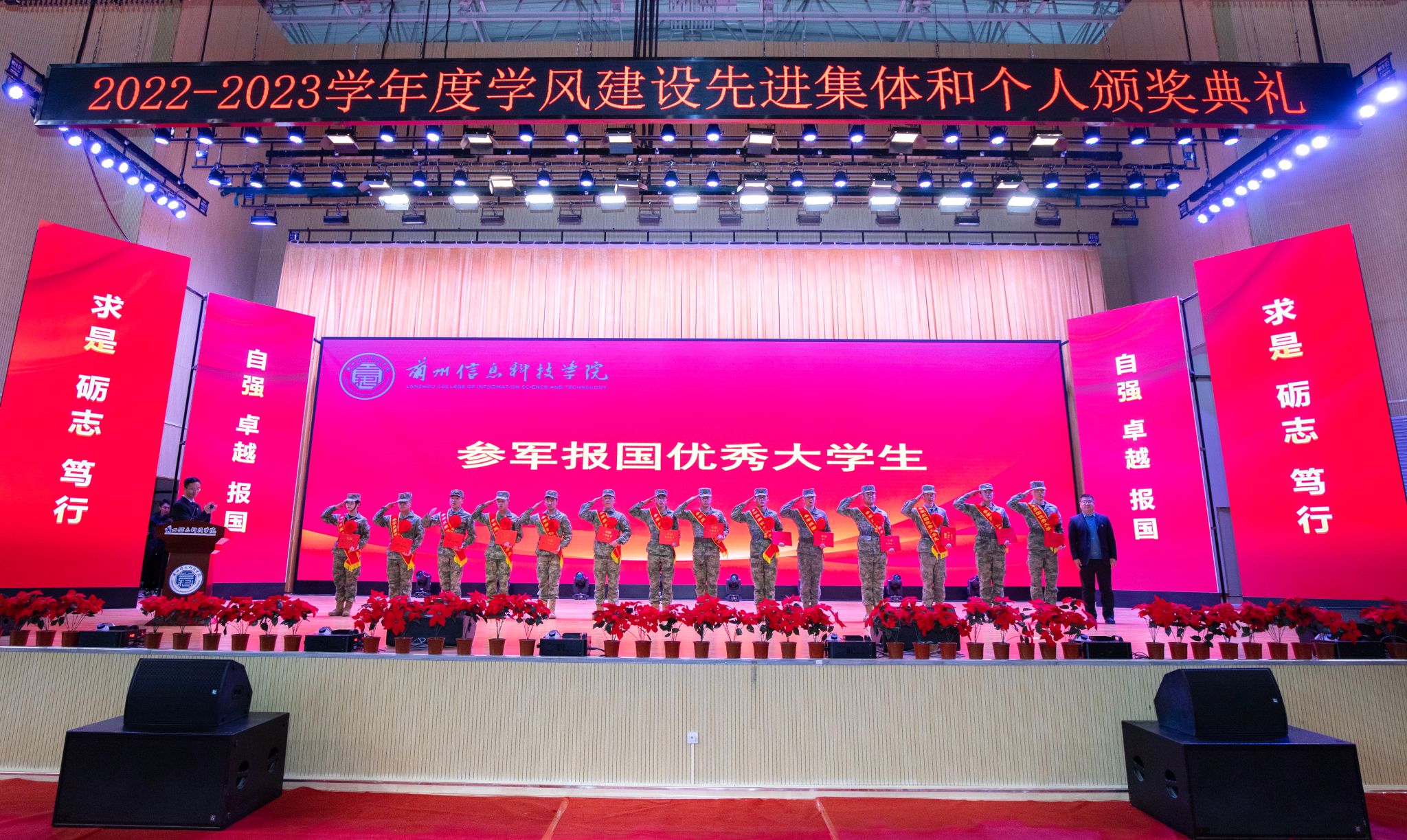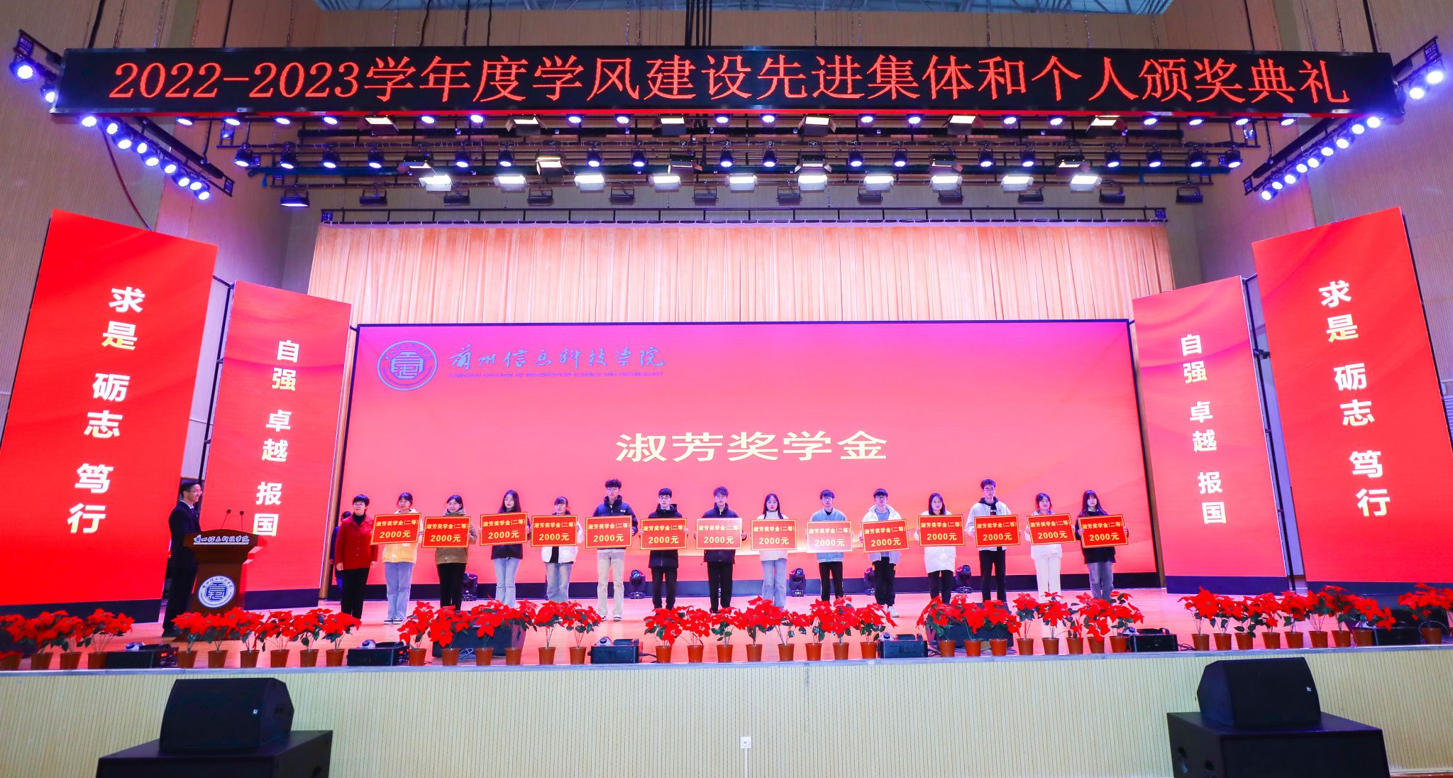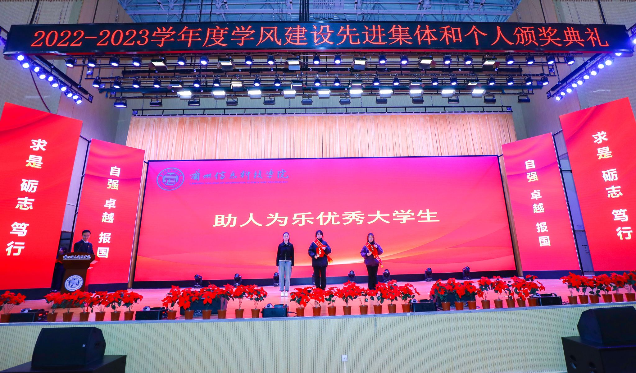 颁奖典礼在庄严的中华人民共和国国歌声中拉开帷幕。大会分别宣读了《关于表彰2022-2023学年学生评奖评优获奖集体和个人的决定》《关于表彰2022-2023学年“宿舍文明建设工程先进集体”“学风建设标兵宿舍”“文明宿舍”“卫生先进宿舍”的决定》《关于表彰20周年校庆“优秀志愿者”“优秀演员”的决定》《关于授予赵雅琪等3名同学“勤奋好学优秀大学生”荣誉称号的决定》《关于授予陈鑫等26名同学“科技创新优秀大学生”荣誉称号的决定》《关于授予高翔同学“见义勇为优秀大学生”荣誉称号的决定》《关于授予班海翔、李鑫2名同学“助人为乐优秀大学生”荣誉称号的决定》《关于授予丁昊等5名同学“身残志坚优秀大学生”荣誉称号的决定》《关于授予马成龙同学“自强不息优秀大学生”荣誉称号的决定》《关于授予彭程等50名同学“参军报国优秀大学生”荣誉称号的决定》文件,并现场为每项获奖集体和个人分别宣读了颁奖词,与会校领导为获奖集体与个人颁奖。