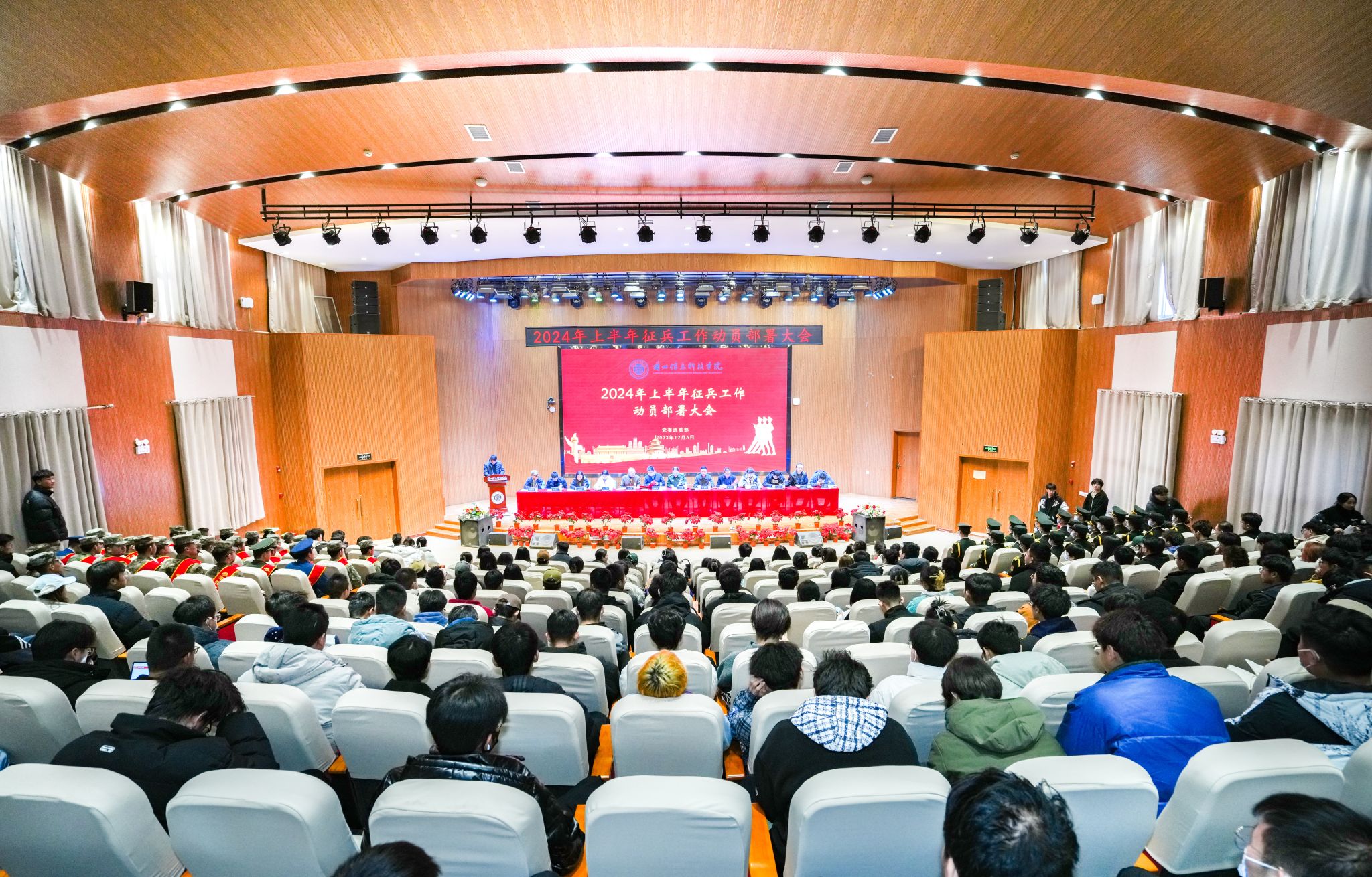 12月6日,开元集团网站2024年上半年毕业生征兵工作动员部署大会在2号学术报告厅举行。皋兰县人民武装部副部长李向阳、校长助理朱明敏及党委武装部、学生处、教务处、就业服务中心、团委全体人员,各二级学院学生副院长、学生发展中心主任、全体辅导员,2024届毕业班班长、团支书,退役复学学生代表、意向入伍学生代表参加动员大会。
