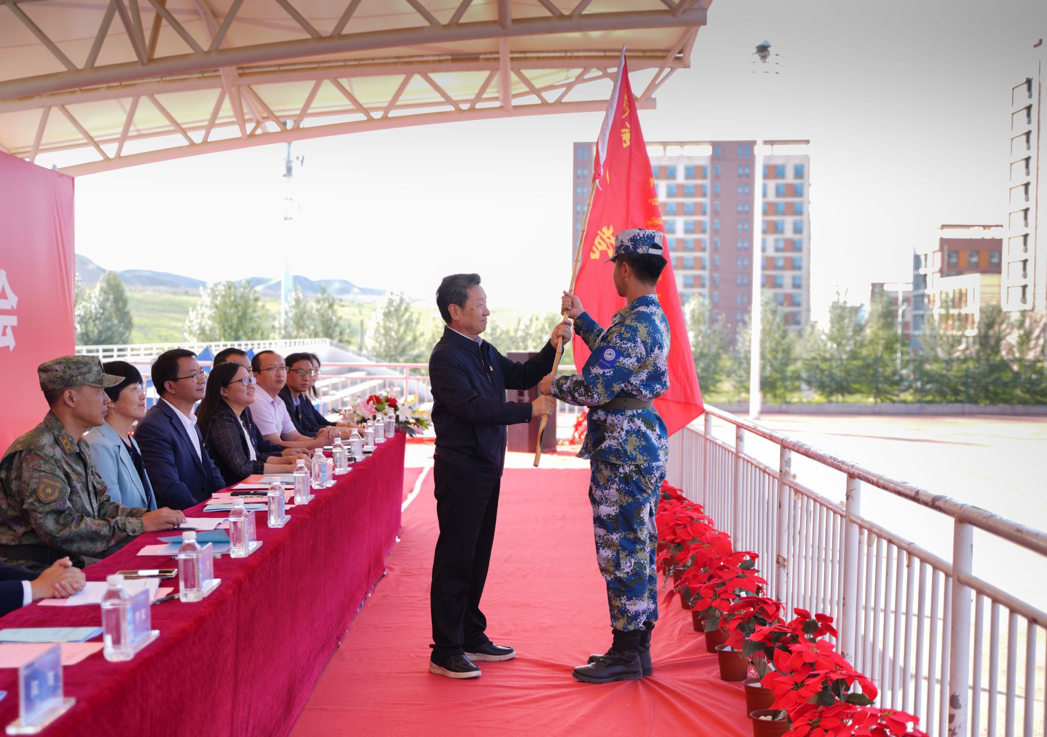 伴随着嘹亮的国歌声,五星红旗徐徐升起。校长助理殷学丽宣读《关于成立开元集团网站2023年学生军训工作领导小组及训练方队的通知》,党委副书记、副校长郭筱磊宣读《关于成立开元集团网站2023年学生军训临时党支部的通知》,党委书记周怀春向军训方队代表授队旗。