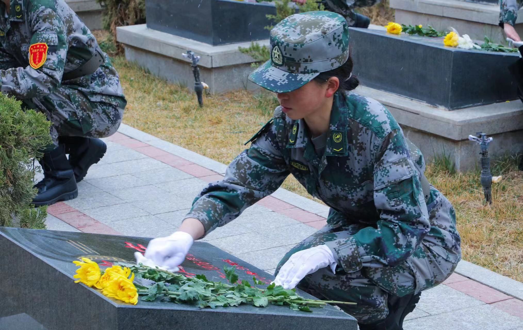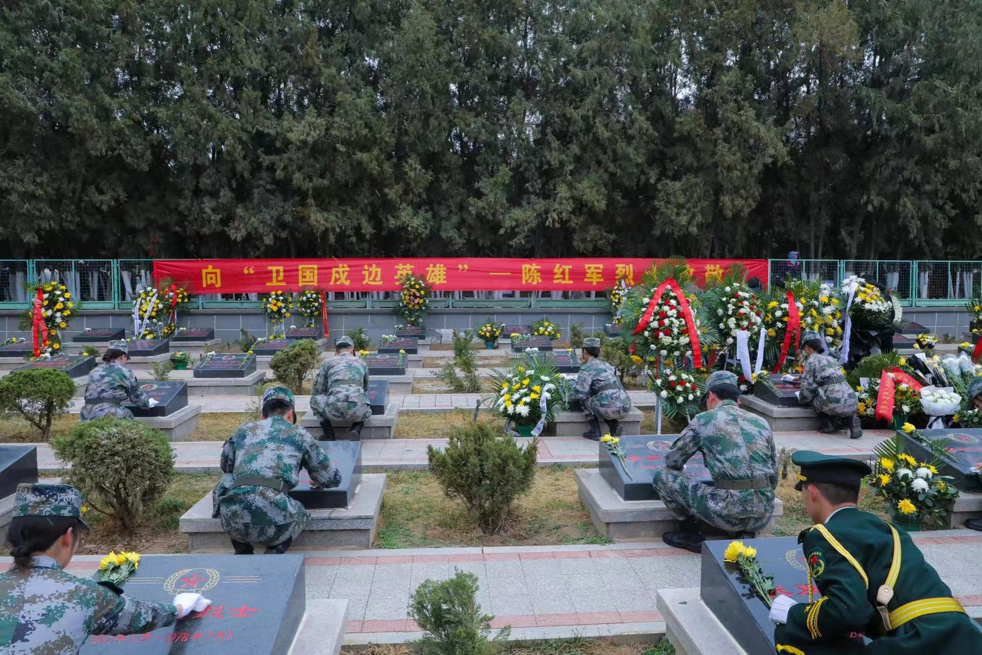 师生代表在革命烈士纪念碑前齐唱中华人民共和国国歌并依次向革命烈士敬献花篮,表达对革命烈士的崇高敬意和无限哀思。在“卫国戍边英雄”陈红军烈士墓前,师生代表认真倾听工作人员讲解关于陈红军烈士的英雄事迹,蹲下身用心擦拭自己面前的墓碑。