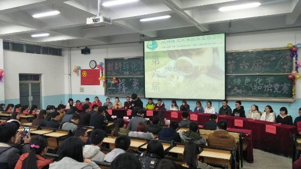 为了激发广大学生对化学知识的热情和兴趣,提高和拓宽大学生化学知识能力的思路、途径和方法,培养在校大学生严谨的学习态度、科学的创新能力。材料与化工工程系于2017年11月26日晚19:00在求是楼D区401教室成功举办了第六届“绿色化学”知识竞赛。