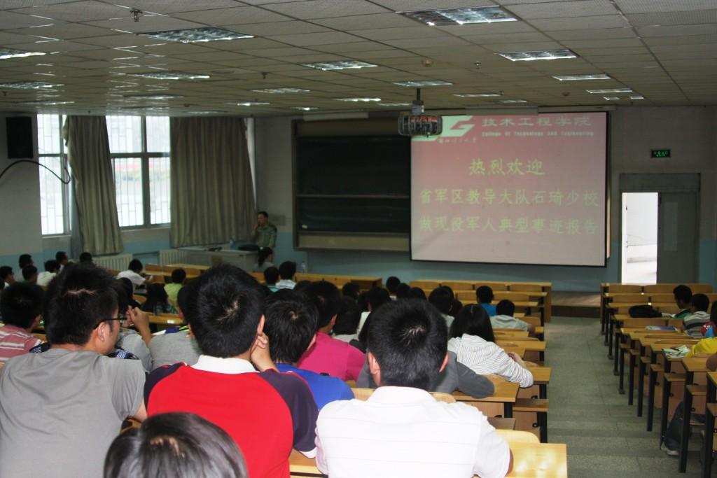 为贯彻落实国家鼓励高校毕业生应征入伍服义务兵役的精神,确保我院毕业生入伍预征工作顺利开展,全力以赴做好我院毕业生入伍预征工作,同时也为今后的预征工作打下良好的基础,按照《关于做好普通高等学校应届毕业生征集工作的通知》以及《关于举办2011年全省高校毕业生入伍预征宣传暨政策咨询周活动的通知》(甘人教〔2011〕22号)等相关文件精神和要求,2011年5月26日晚,我院邀请甘肃省军区教导大队石琦少校为我院学生作了现役军人典型事迹报告。