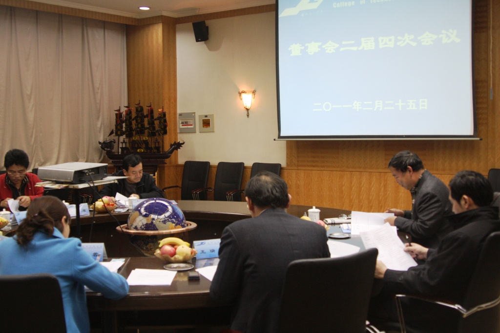 2011年2月25日晚8:00,学院董事会二届四次会议在兰州理工大学逸夫科技馆2号会议室召开,出席本次会议的董事有王晓明、王智平、高君、王瑞祥、邱平 、张忠赓,监事会成员蔡颖、姜晓华列席了本次会议。会议由学院董事长王晓明主持。