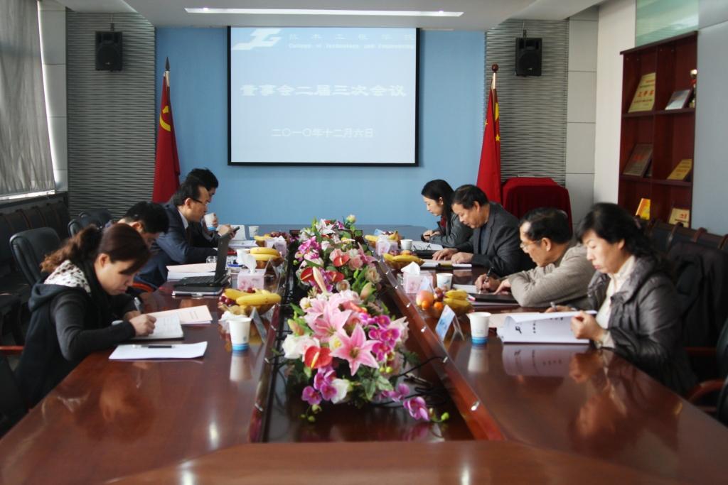 2010年12月6日上午10:00,学院董事会二届三次会议在砺志楼行政办公区402会议室召开,出席本次会议的董事有王晓明、高君、王瑞祥、邱平 、张忠赓,监事会成员蔡颖、姜晓华列席了本次会议。会议由学院董事长王晓明主持。