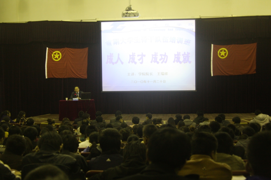 2010年11月20日晚7点半,学院首期大学生骨干队伍培训会在砺志楼E区201多功能报告厅举行。学院院长王瑞祥给学院全体辅导员和学生干部进行了一场主题为“成人、成才、成功、成就”的专题培训。