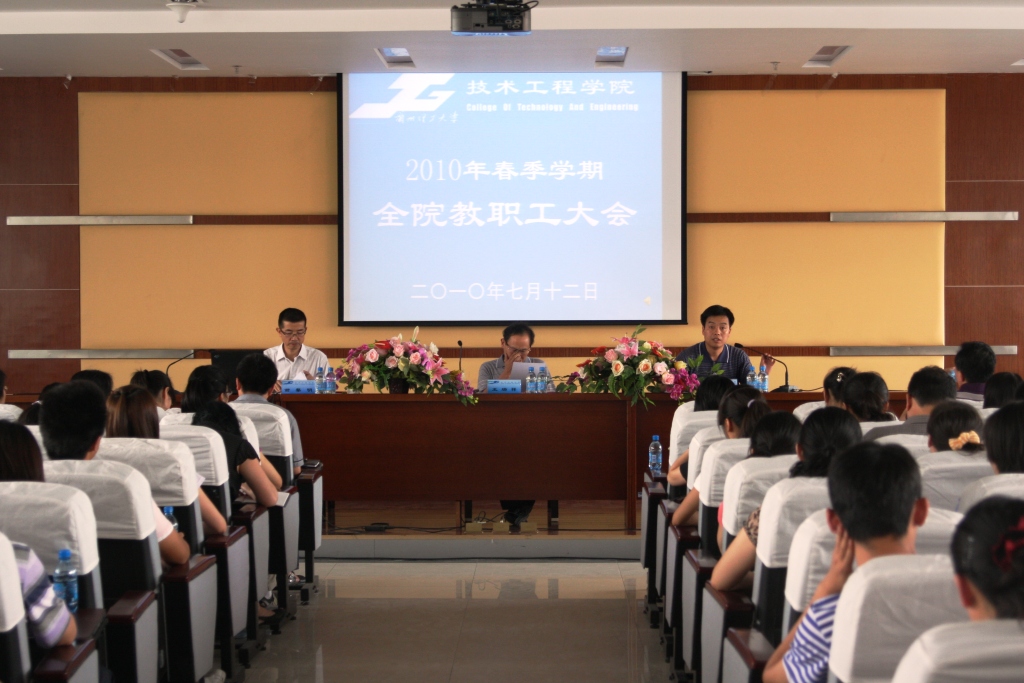 2010年7月12日下午三点,学院在砺志楼行政办公区5楼多功能报告厅召开2010年春季学期全院教职工大会。学院院长王瑞祥,党委副书记、副院长王佰成,副院长谢黎明及全院教职工参加了会议。大会由学院党委副书记、副院长王佰成主持。