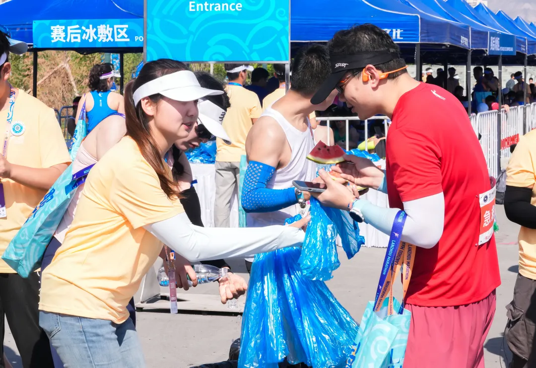 在半程马拉松终点,志愿者们展现出令人惊叹的效率。冰敷组的志愿者抱着大冰块投入冰敷池中,为运动员赛后放松做好准备。“PB衫”领取组的志愿者迅速学习系统的操作、录入,确保取得个人最好成绩的运动员有序领取到“PB衫”。“拍照兰精灵”提前测试好机位,为参赛选手、其他志愿者、观赛市民提供拍照服务,并指导他们摆好“pos”,留下最珍贵的记忆。
