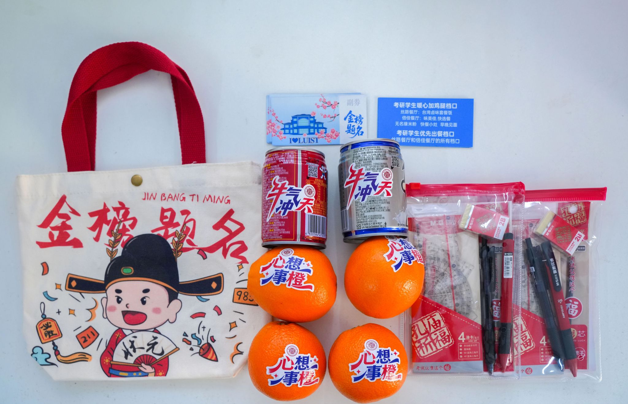此次派发的助考锦鲤包承载着满满的暖心祝福:“金榜题名”定制手提袋寓意前程似锦;孔庙祈福答题套装寄托“逢考必过”的美好期许;贴有校标与专属祝福语的旺仔牛奶,祝愿学子们“牛”气冲天、一战成硕;两个饱满的橙子则象征着“橙”功上岸、心想事“橙”,外加考研上岸助力餐券,为学子们的备考生活增添一份贴心保障。拿到锦鲤包的同学们脸上洋溢着感动的笑容,纷纷表示将把学校的关怀转化为备考的动力,不负期望、奋力拼搏。