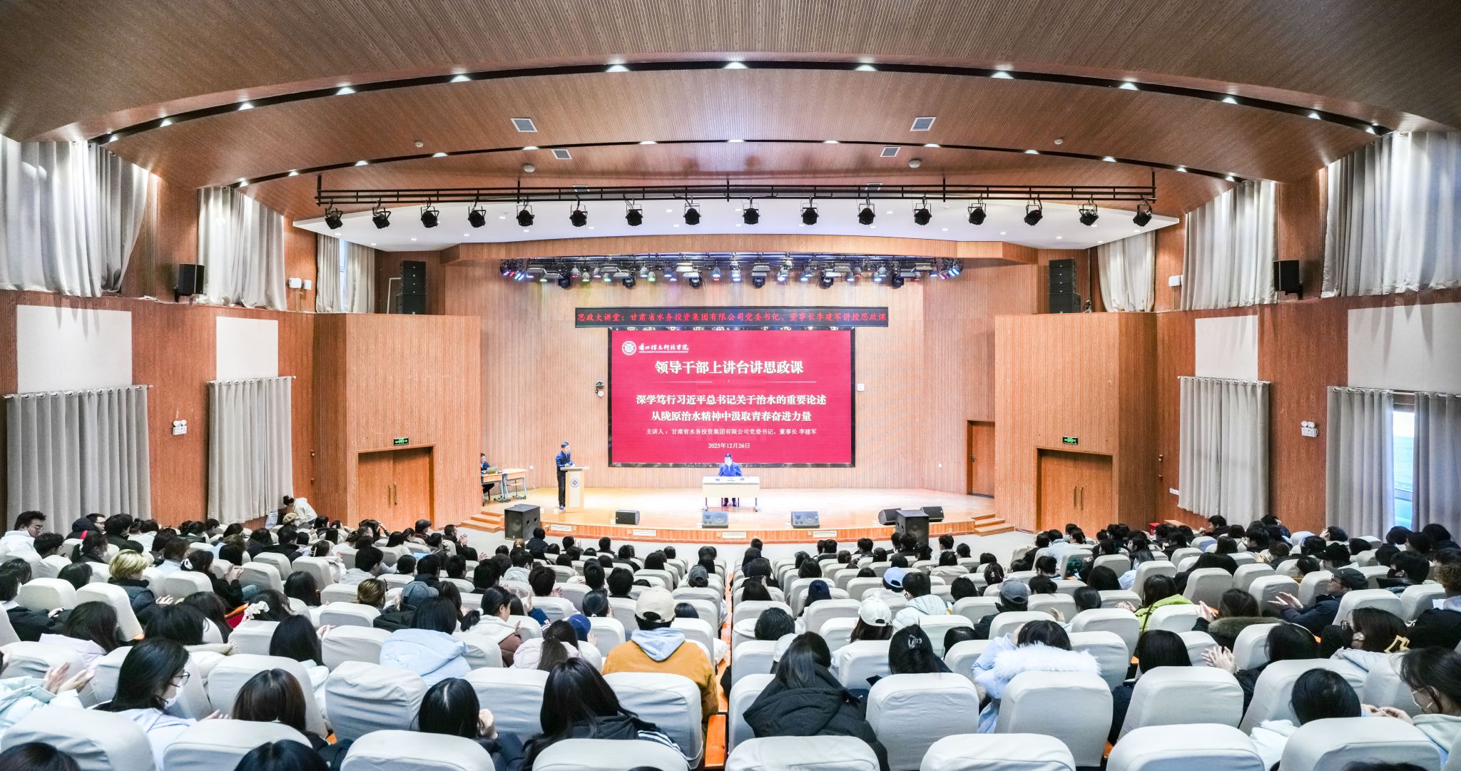 李建军以“水”为核心,紧扣“深学笃行习近平总书记关于治水的重要论述”主线,从“党中央始终心系甘肃的‘水问题’”“甘肃面临的水情现状和现实困境”“甘肃人民艰苦卓绝的治水奋斗史”“甘肃人民治水形成的宝贵精神”“对甘肃省水利事业的展望”及“甘肃水投集团的基本情况”六个方面作深度阐释。他将历史回望、现状分析与未来展望相融合,把宏大叙事与引洮供水、引大入秦等鲜活治水实践相结合,系统梳理了陇原大地从“苦瘠甲于天下”到“清流润万家”的水利发展巨变,让在场师生深刻感悟到甘肃水利事业的艰辛历程与伟大成就。同时,他对当代大学生提出殷切期望,勉励大家深刻领会陇原治水精神中蕴含的坚定信念、坚韧执着与无私奉献内核,补足“精神之钙”,把个人理想融入甘肃现代化建设大局,以青春之力赋能陇原发展。