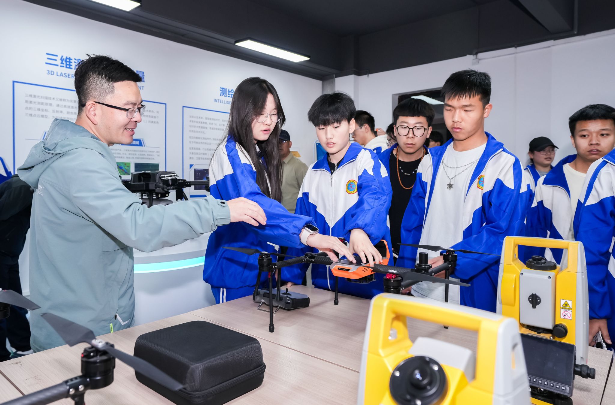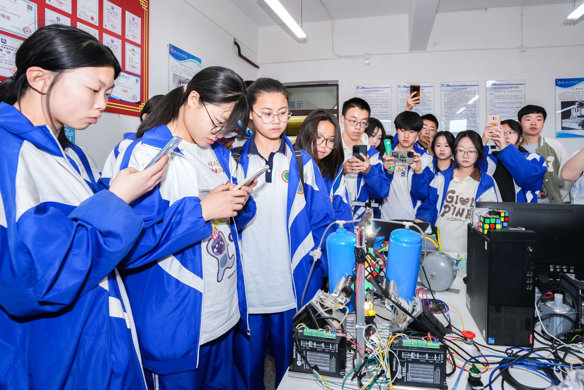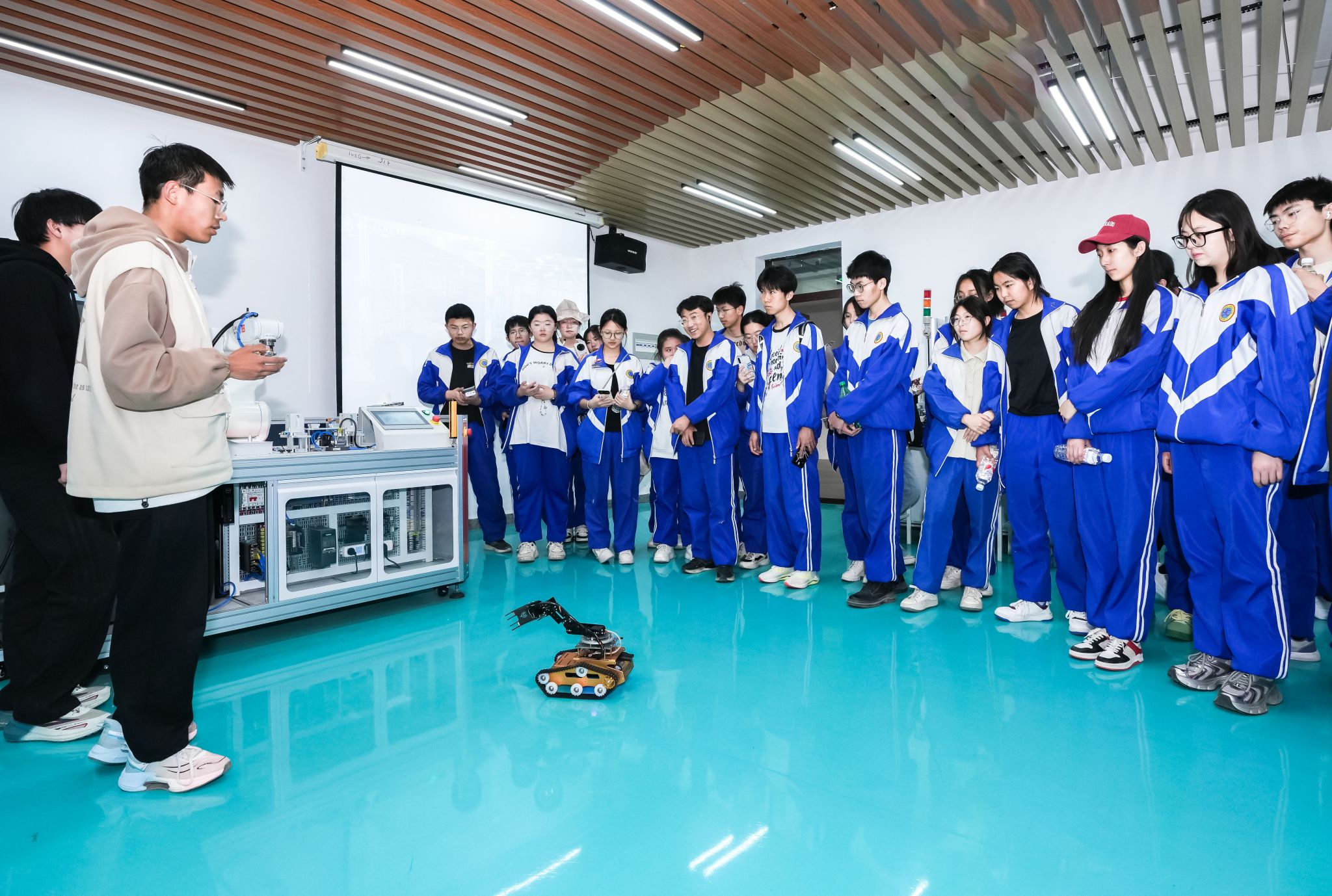 同学们分组体验了工程训练中心、电气控制与自动化实验中心、机械实验教学示范中心、电工电子实验教学示范中心等省级实验教学示范中心;物联网工程实验室等省级重点实验室;人工智能产业学院、智能制造产业学院、优必选机器人产业学院、智能测绘产业学院等校企共建现代产业学院。同学们一边聆听观看主讲老师们详细地介绍与实操,不时与老师交流咨询。