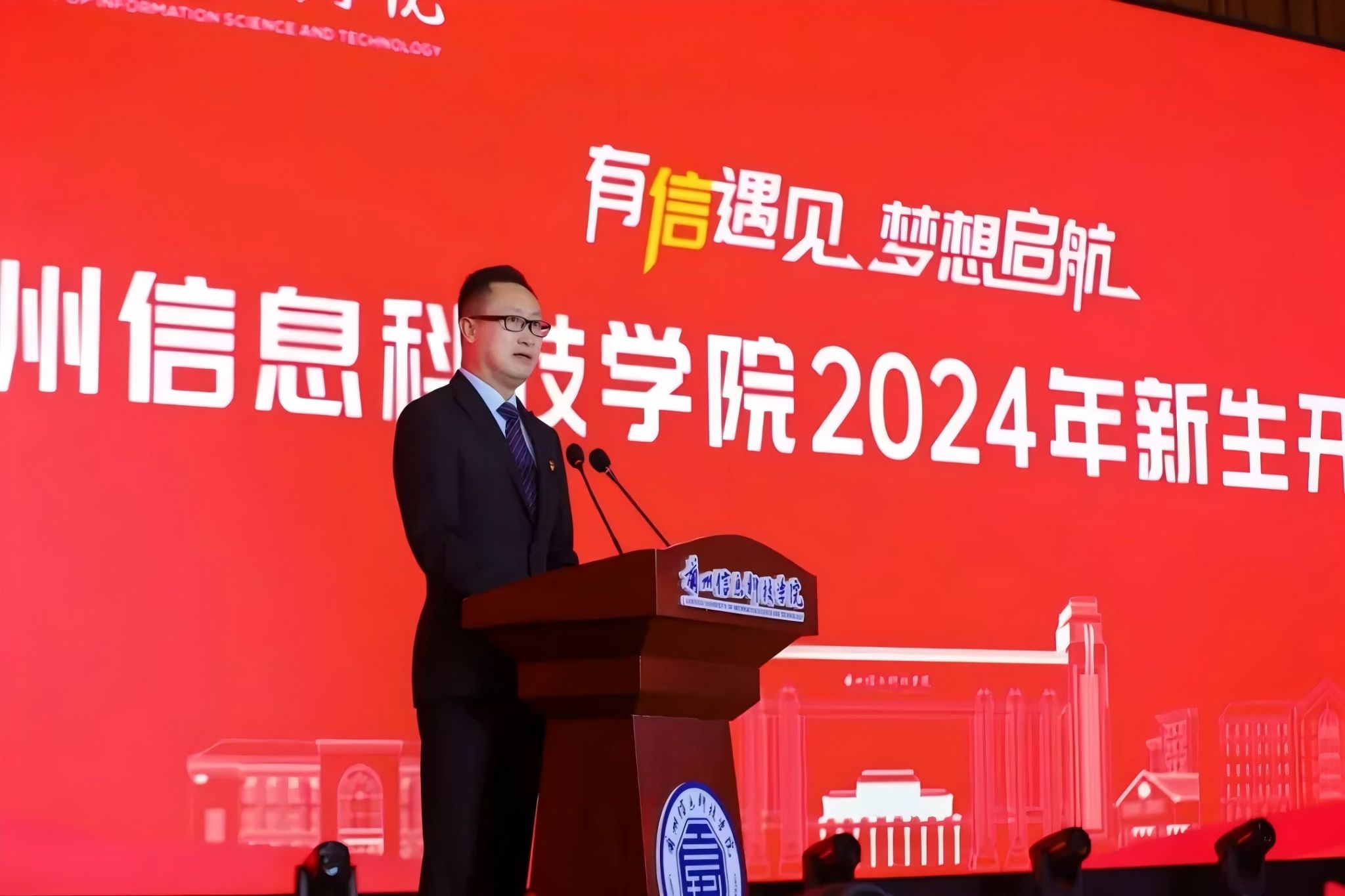在全体新生庄严宣誓之后,理事长兼执行校长黄炜发表《强国复兴有我,青春为序启航》主题讲话,向2024级新生表示欢迎与祝福,并提出五点希望,一是要立大志,坚定理想信念。把个人的梦想和国家的荣誉结合起来,主动将自己的“小我”融入到祖国的“大我”之中。二是要担大任,肩负历史使命。刻苦钻研,追求真理,潜心掌握专业技能,做勇攀高峰的“实干家”。三是要明大德,砥砺人格品行。自觉把道德养成、道德实践紧密结合起来,追求更有高度、更有境界、更有品位的人生,努力成为社会主义核心价值观的践行者。四是要成大才,练就过硬本领。主动锻炼深度学习能力,塑造更新知识结构,学会跨学科跨领域的对话沟通,在不断拓展知识边界、不断进行思想碰撞中激发更多的灵感和创意,用实际行动去践行创新的理念和精神。五是要报大国,坚持追求卓越。有“敢为天下先”的勇气、“初生牛犊不怕虎”的锐气、“狭路相逢勇者胜”的豪气,脚踏实地,心怀责任厚积薄发,以工匠般的实践精神和执著态度标注新高度,开启新征程,逐梦新阶段。