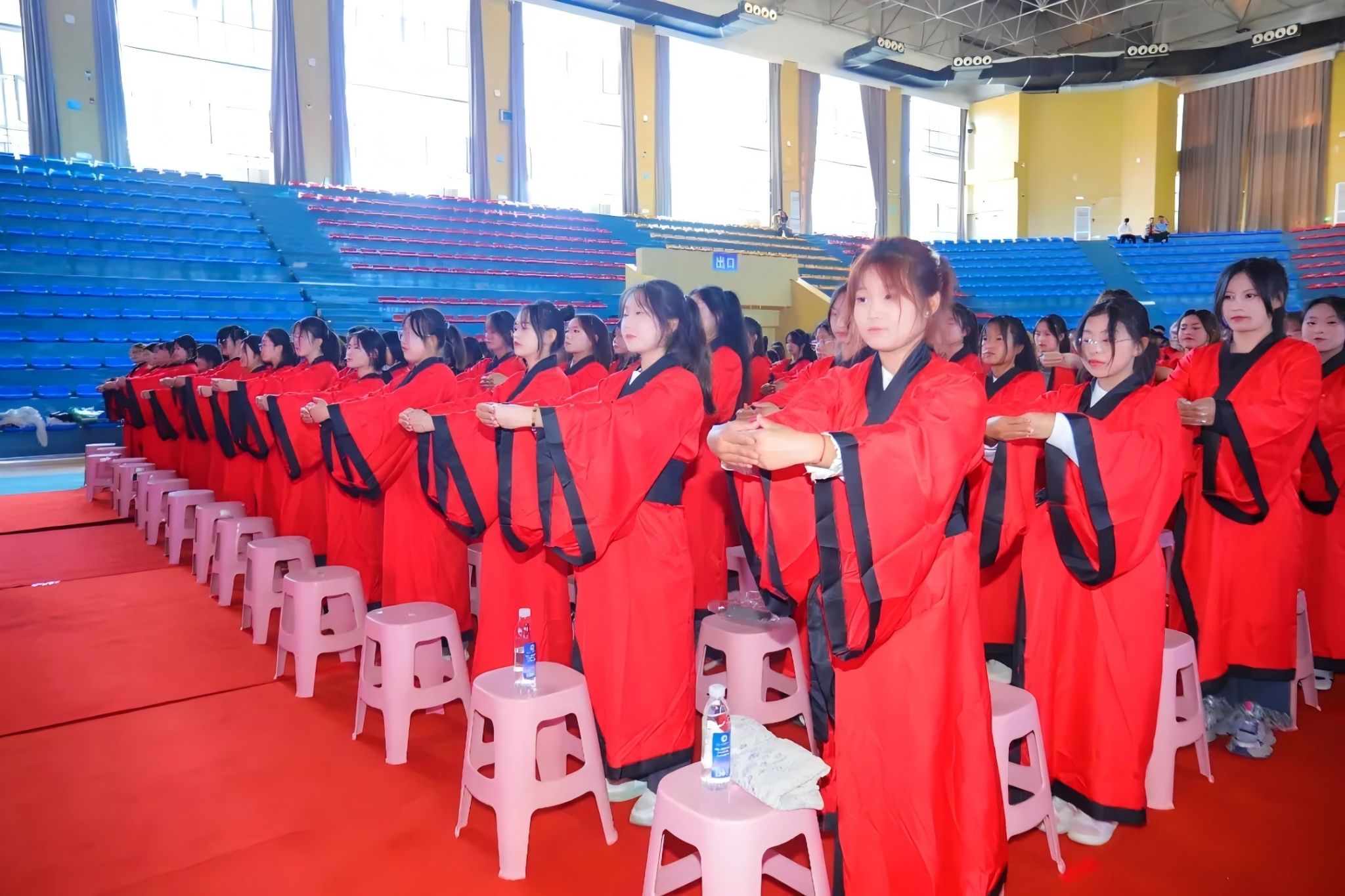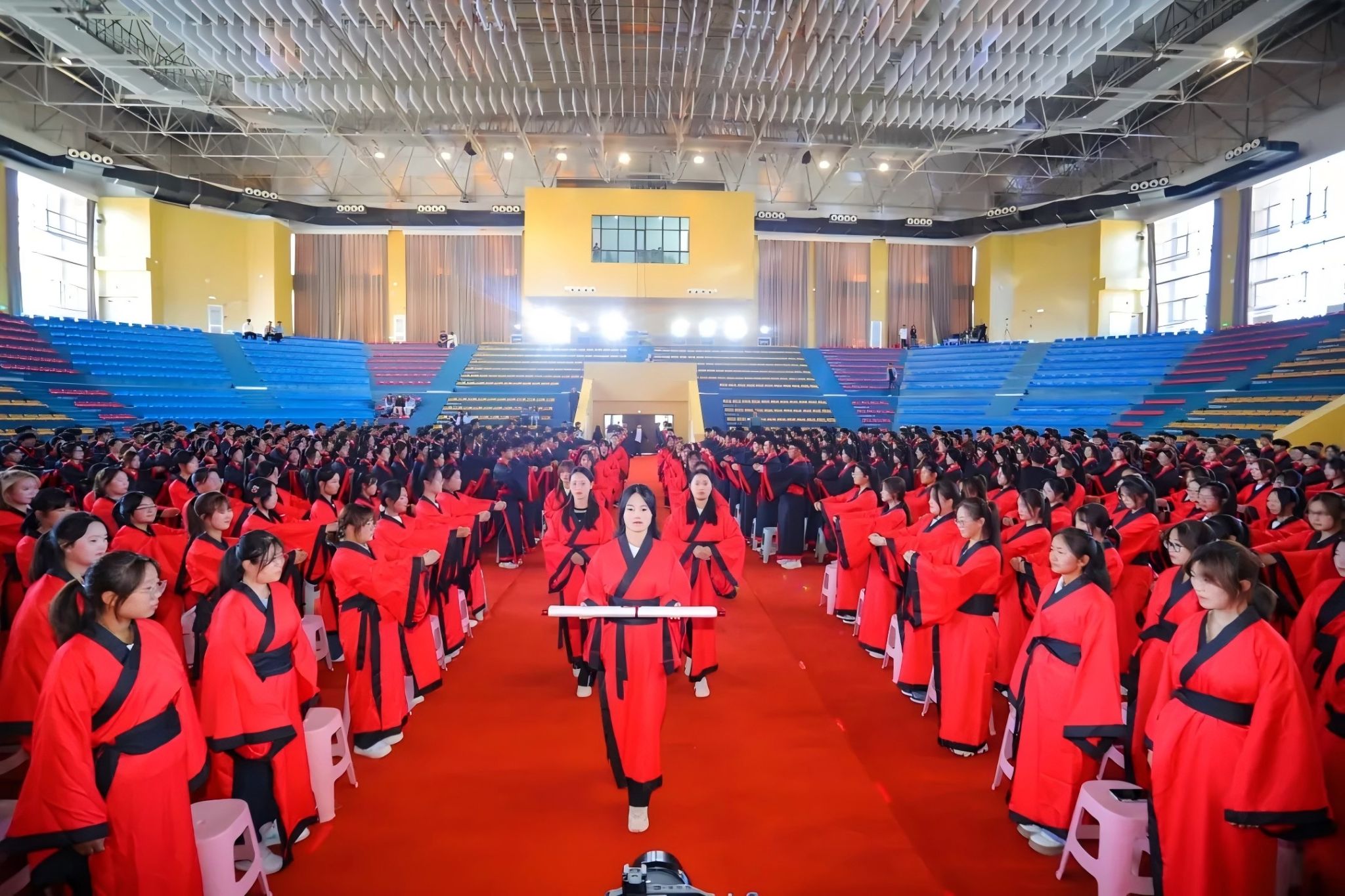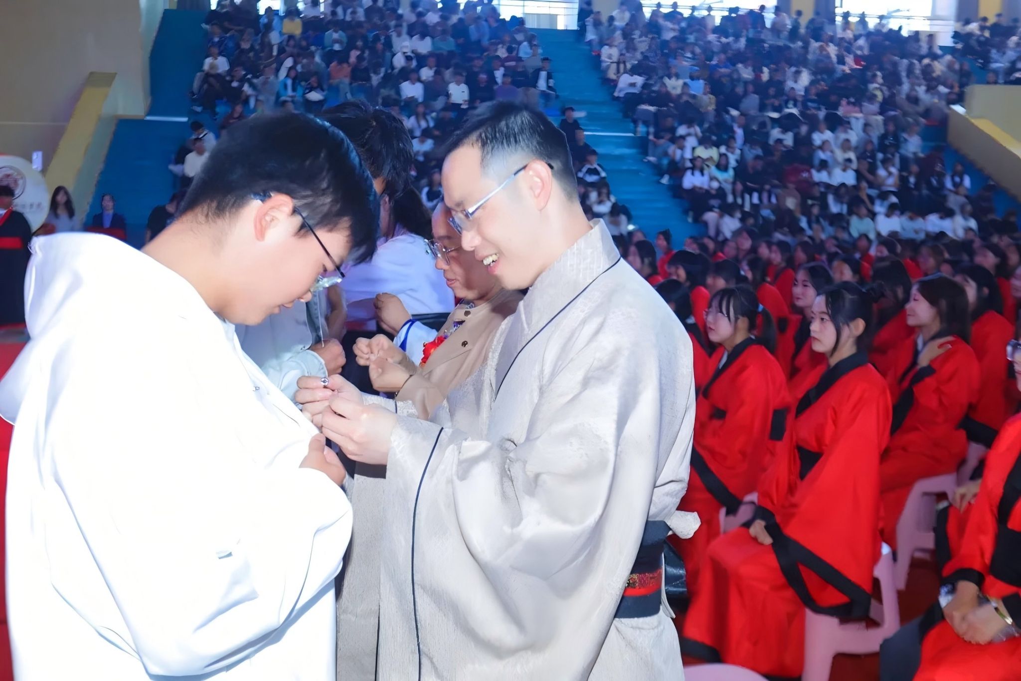身着汉服的新生代表学生护送《大学》卷轴进入会场,全体新生与“师长”互行“拱手礼”。校长程兰华携全体“师长”向至圣先师孔子像行三鞠躬礼,“一拜自强不息,二拜厚德载物,三拜孝亲尊师”。