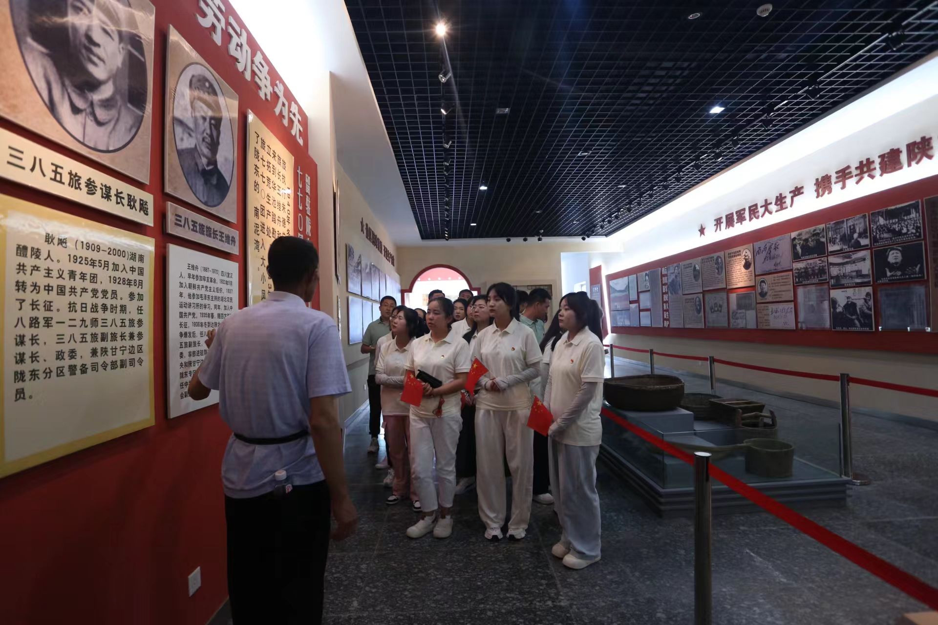 纪念仪式中,全体师生在革命烈士纪念碑前整队肃立,怀着对革命先烈的崇高敬意和深切缅怀,向英勇牺牲的烈士敬献花篮、鞠躬默哀,并面向党旗重温入党誓词。步入南梁革命纪念馆,历史的厚重感油然而生。一篇篇文字、一张张图片、一幕幕场景,铭记着南梁革命斗争波澜壮阔的岁月,实证着中国共产党人改天换地的气魄、坚如磐石的信念和为民谋福的无悔初心。在讲解员的讲解和引导下,全体师生认真聆听老一代革命家组建中国工农红军陕甘游击队、中国工农红军第二十六军、陕甘边区革命委员会、陕甘边区苏维埃政府和革命军事委员会的历史经过,参观了刘志丹、谢子长、习仲勋等老一辈无产阶级革命家不畏艰险、舍生忘死的不朽功绩,深切感悟他们对党无限忠诚、对共产主义事业无比坚定的理想信念,深刻理解了“面向群众、坚守信念、顾全大局、求实开拓”的南梁精神。