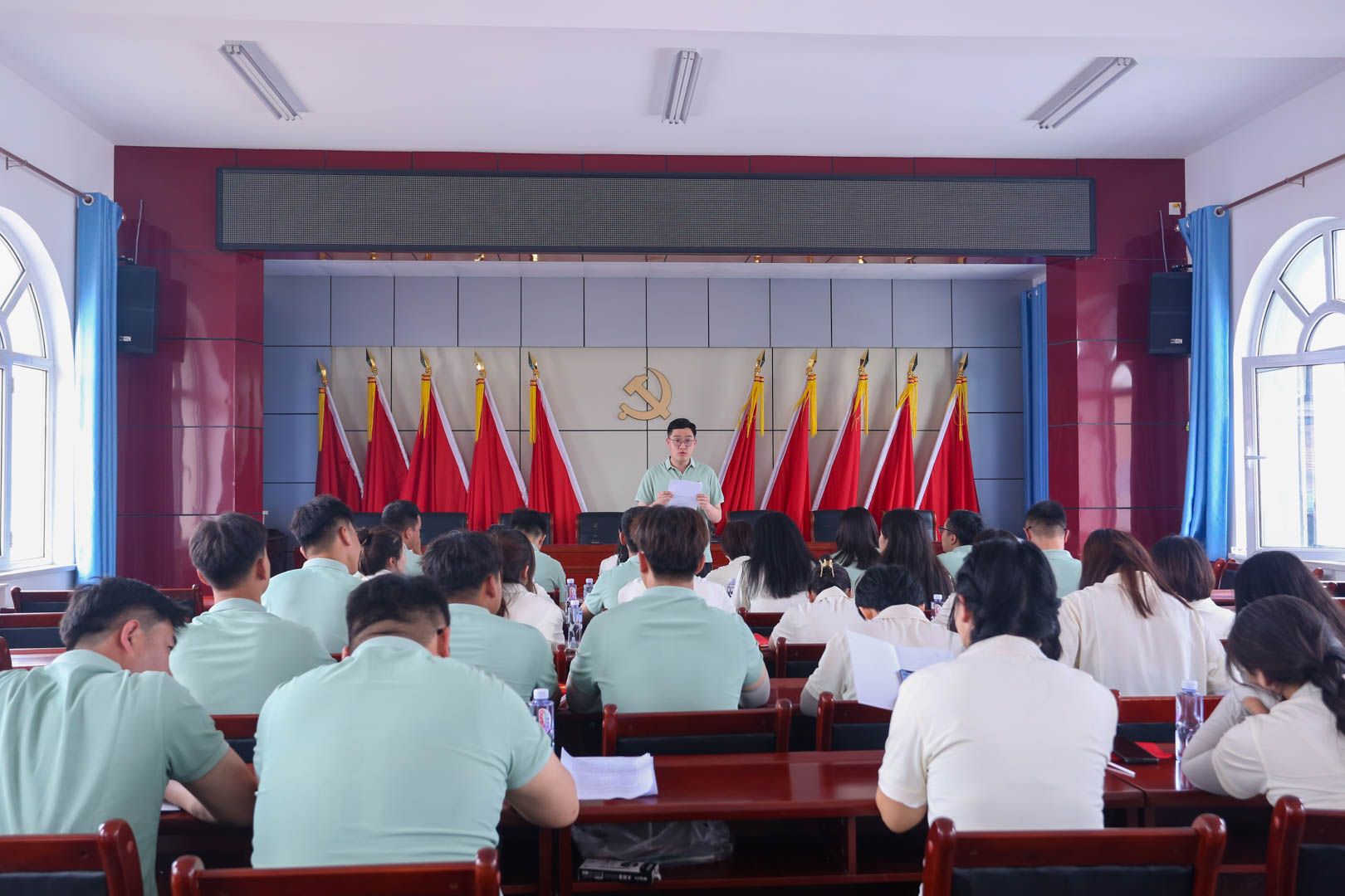 研修第二天上午,研修队伍到达南梁革命纪念馆开展活动。研修团队师生首先在陕甘边区苏维埃政府旧址聆听了由华池县党史宣讲团成员为主讲的题为《弘扬南梁精神,坚持人民至上》的现场教学课,随后由马克思主义学院思政课教师代表开展了题为《南梁精神的内涵和现实意义》的专题党课。