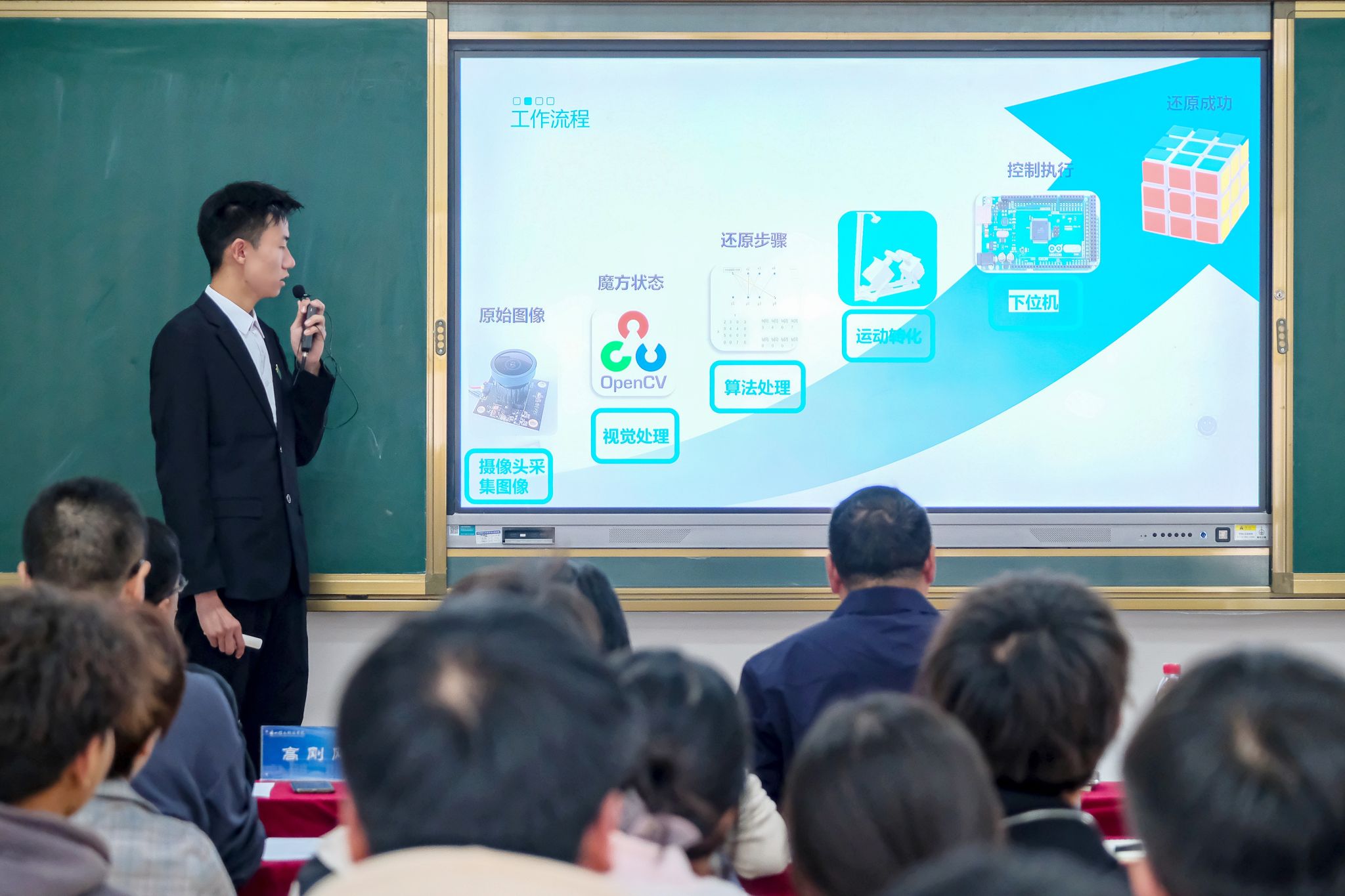 经过前期综合评定、遴选,共有6个项目进入此次答辩,进行项目陈述和专家质询。分别为《终极挑战——四代魔方机器人》《护花使者——家庭绿植养护系统》《光线之美——MSLA光固化3D打印机研发》《小小球童——基于STM32 的智能中小球“滚筒式”收集车》《开心果园——基于树莓派 ROS 系统的视觉采摘小车》《飞舞的梦想——具备多种飞行姿态的仿生蝴蝶的研发》,内容覆盖机械设计、机电控制、人工智能、机器视觉、大数据技术、物联网技术、仿生科学、光电技术及自动化技术等诸多智能制造的前沿领域。