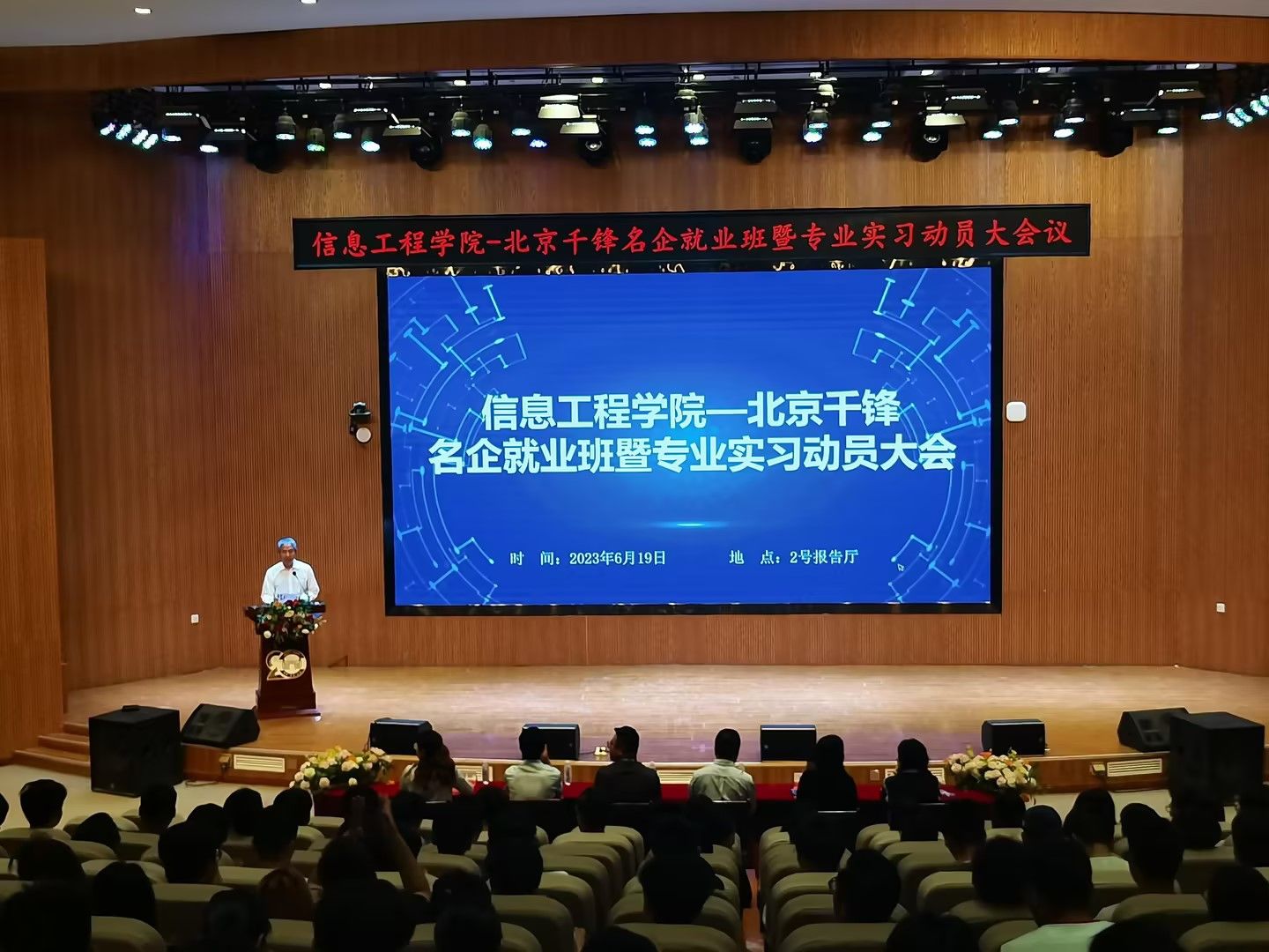 为深入贯彻落实学校“高质量就业是立校之本,高质量育人是生命线”的发展战略,进一步规范专业实习的组织与管理,帮助学生提升独立开展专业实践的能力,增加就业核心竞争力。6月19日上午,开元集团网站信息工程学院在2号报告厅召开北京千锋名企就业班暨2020级专业实习动员大会,北京千锋互联科技有限公司院校合作部大区总监路愿飞,院校合作部大区经理张绍光,信息工程学院执行院长朱明敏,副院长刘彩文,各系主任、专业教师、20级辅导员、19级名企就业班优秀学生代表及20级学生代表参加了动员大会。