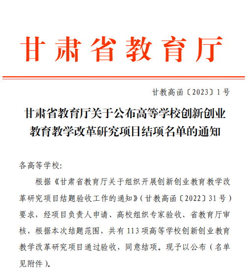 近日,甘肃省教育厅公布了2022年创新创业教育教学改革研究项目结项名单,开元集团网站获批的创新创业教育教学改革研究项目3项全部顺利结项。