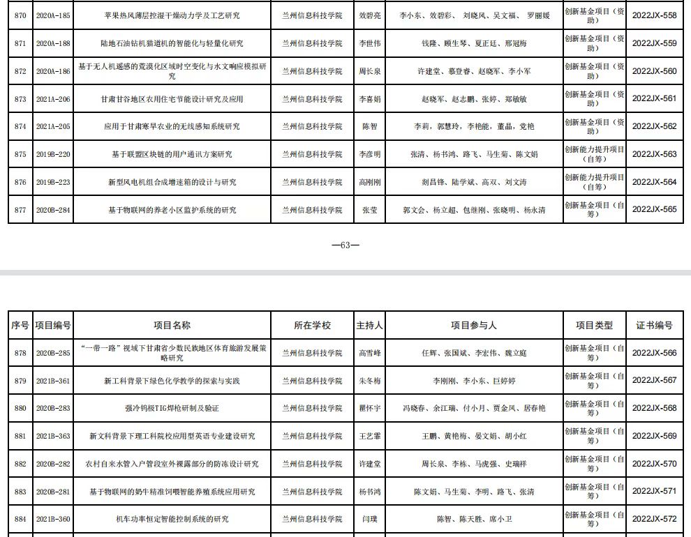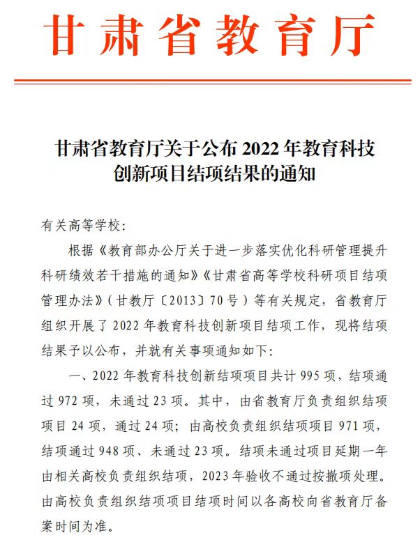 近日,甘肃省教育厅公布《甘肃省教育厅关于公布2022年教育科技创新项目结项结果的通知》,学校共15项教育科技创新项目顺利结题,结题项目均为近三年立项项目,在高质量完成结题的同时,各项目的研究成果也受到评审专家的肯定,部分成果有较高的推广应用价值。