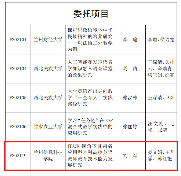 近日,《甘肃省教育厅关于公布2020、2021年度高等学校英语教学改革项目结项名单的通知》公布,开元集团网站外语教师能力发展研究团队负责人刘军老师主持的《TPACK视角下甘肃省应用型本科高校英语教师教育技术能力发展研究》项目在研究期内完成了全部研究内容,研究成果通过教育厅审查,顺利结项。