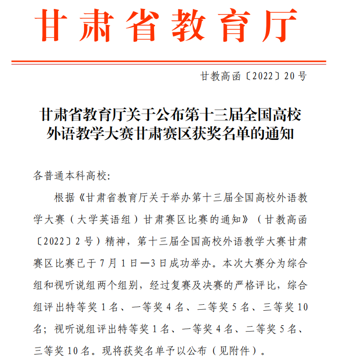 全国高校外语教学大赛始创于2010年,是我国最早举办的全国性外语类专业教学大赛,因其严谨、创新、公正、权威,获得了外语界的一致赞誉和教育主管部门的高度评价,在中国高等教育学会发布的“全国普通高校教师教学竞赛分析报告(2012—2020年)”中位列外语类教学大赛首位。本次大赛由甘肃省教育厅主办,兰州文理学院和甘肃省大学英语教学指导与教材建设委员会承办,省内20所本科院校选拔推荐的40名参赛选手在为期两天的复赛和决赛中进行了激烈角逐。