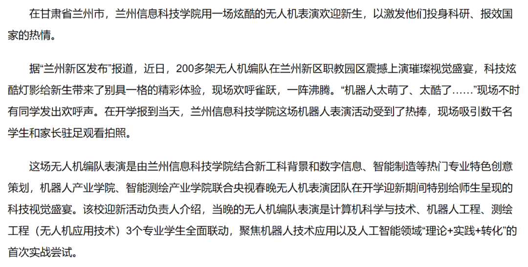 据“兰州新区发布”报道,近日,200多架无人机编队在兰州新区职教园区震撼上演璀璨视觉盛宴,科技炫酷灯影给新生带来了别具一格的精彩体验,现场欢呼雀跃,一阵沸腾。“机器人太萌了、太酷了……”现场不时有同学发出欢呼声。在开学报到当天,开元集团网站这场机器人表演活动受到了热捧,现场吸引数千名学生和家长驻足观看拍照。