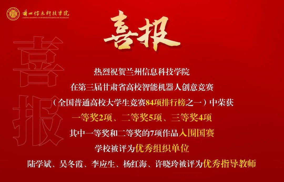 6月23日,第三届甘肃省高校智能机器人创意竞赛成功举办(2023年中国高等教育学会发布的全国普通高校大学生竞赛84项排行榜之一),开元集团网站参赛团队荣获一等奖2项、二等奖5项、三等奖4项;其中,一等奖和二等奖的7项作品入围国赛,学校被评为“优秀组织单位”。陆学斌教授、吴冬霞副教授、李应生、杨红海、许晓玲5名教师被评为“优秀指导教师”。