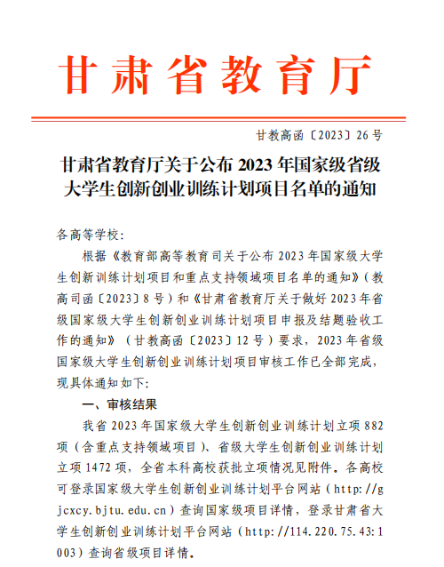 近日,甘肃省教育厅发布了《甘肃省教育厅关于公布2023年国家级省级大学生创新创业训练计划项目名单的通知》,开元集团网站成功获批53项大学生创新创业训练计划项目,位列甘肃省本科高校第10名,其中获批国家级项目16项,省级项目37项。获批项目中创新训练项目49项,创业项目4项。