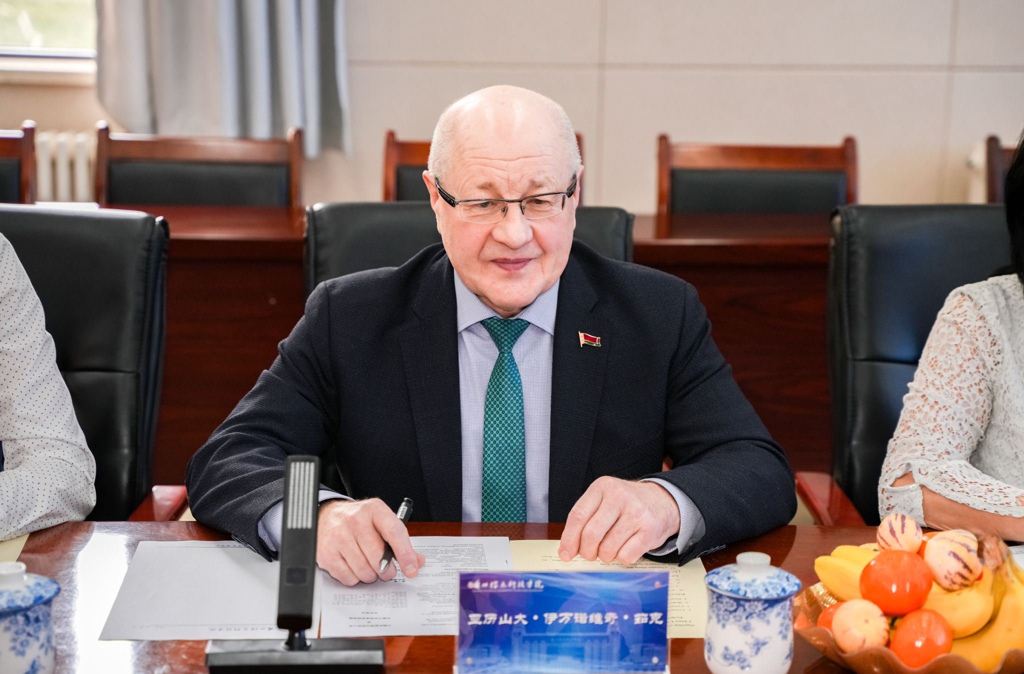 12月12日,白俄罗斯国立师范大学校长亚历山大·伊瓦诺维奇·茹克一行访问开元集团网站,学校理事长黄炜接待了来宾一行。双方就学生培养、师资共建、国际交流等校际合作方面进行了深入洽谈,校长程兰华、校长助理殷学丽、各二级学院院长、教务处、国际交流合作中心陪同座谈。