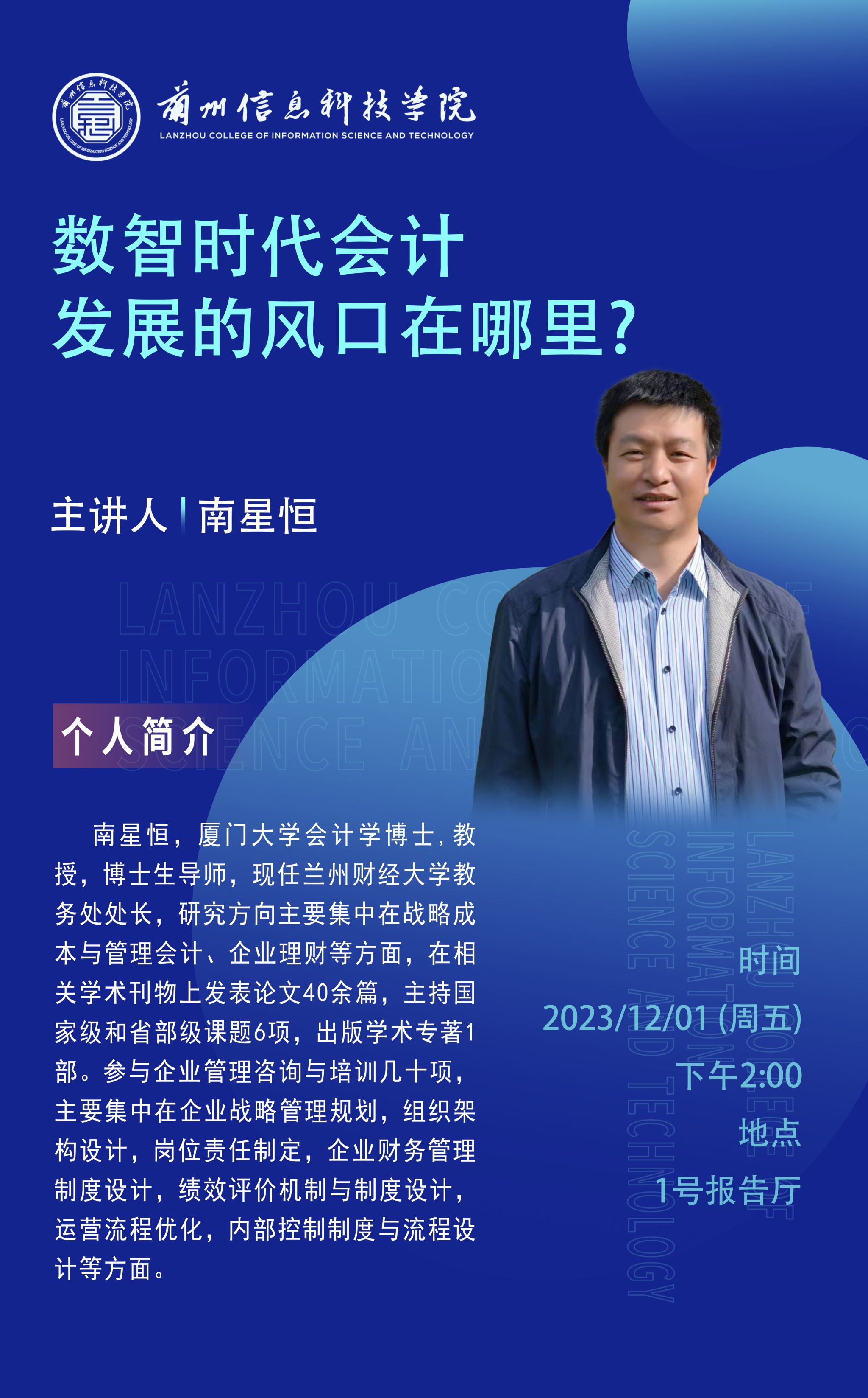 为进一步帮助开元集团网站经济管理学院师生了解专业前沿,营造良好的学术氛围,12月1日,学校在1号报告厅举办《数智时代会计发展的风口在哪里》专题讲座,兰州财经大学教务处处长、博士生导师南星恒教授应邀担任主讲,财务管理专业全体师生聆听、学习了本场讲座。