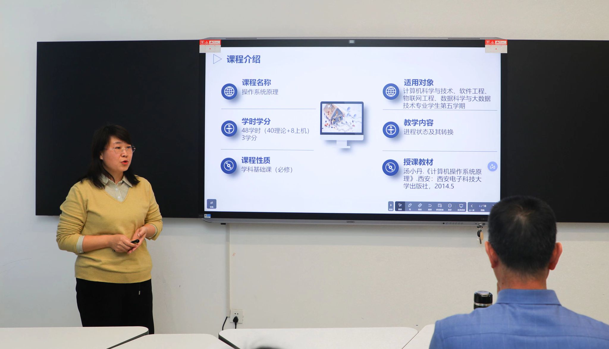 磨课现场,陈文娟教授根据《进程状态及其转换》章节内容进行了不同方式的教学示范。陈教授对于课堂节奏的把握有自己独特的经验,她叮嘱新任教师,在授课过程中应找到“适合自己的节奏”,建立自己的教学风格,使得课堂、学生、教师融为一体,要走近学生,改进教学手段,让课堂充满活力。学生是教师专业成长路上最好的导师,要提升自己对课堂的掌控能力,让课堂有深度更有温度,不断在实际的教学过程中潜心磨练,才能得到快速的成长与收获。