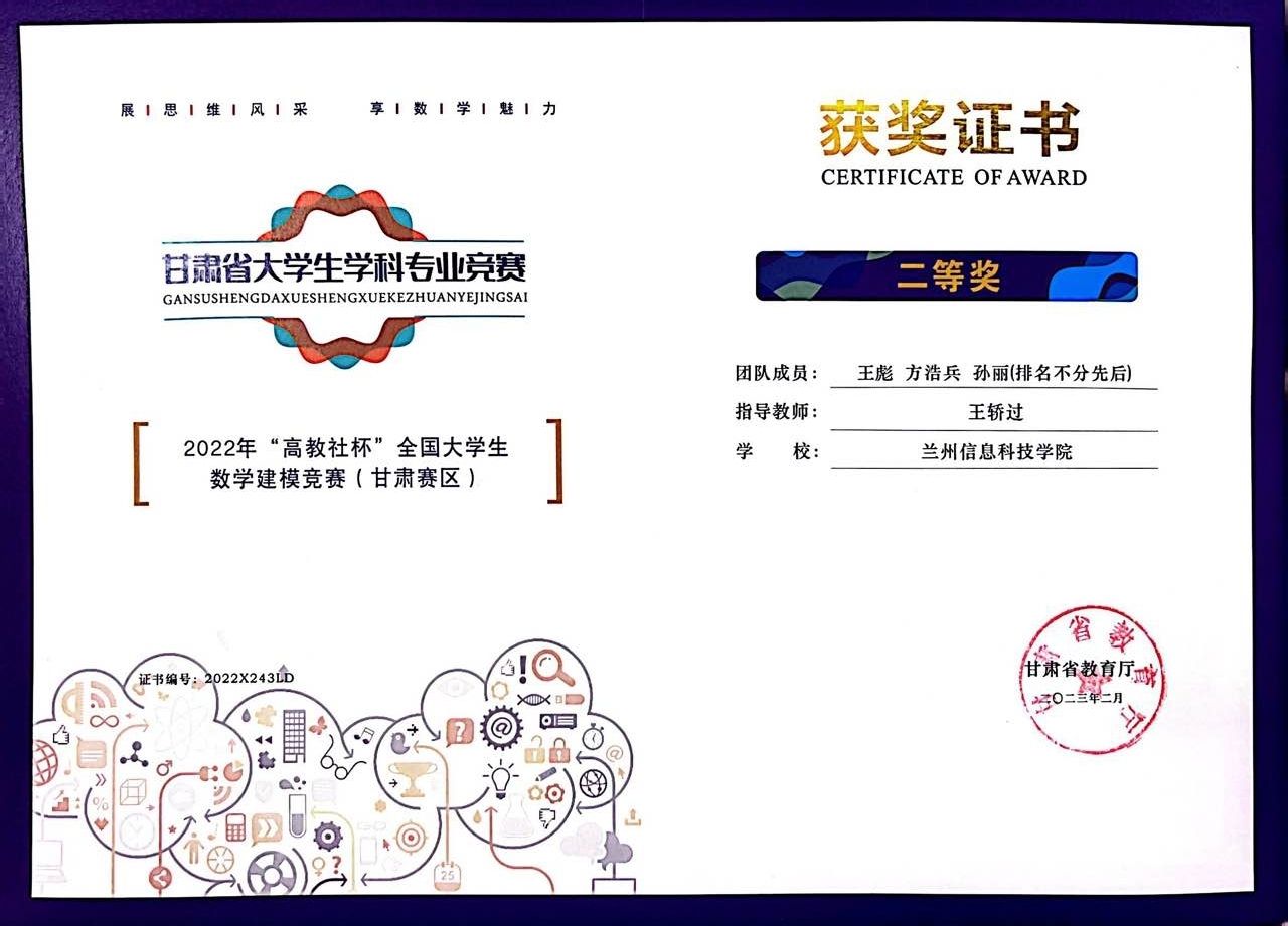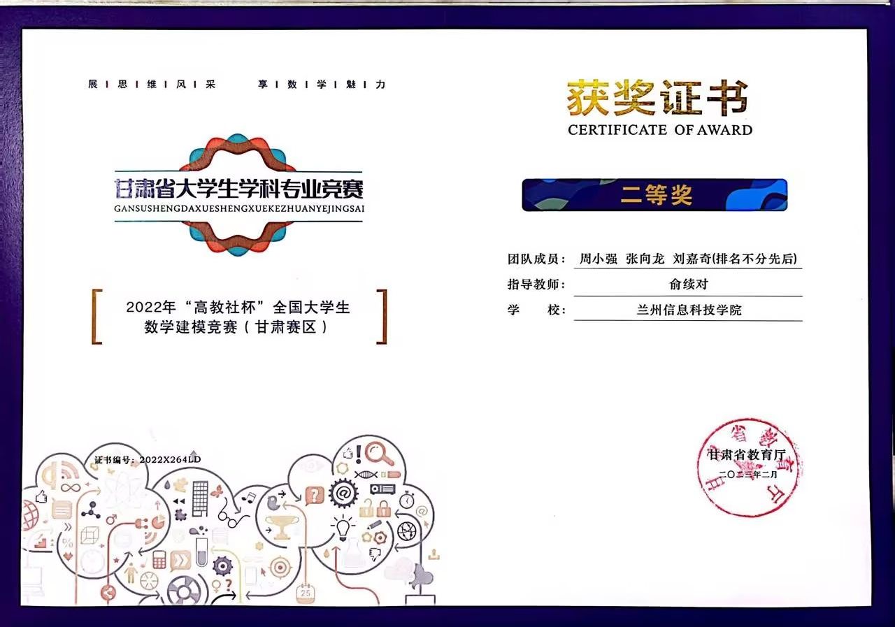 近日,甘肃省数学会公布了第十四届全国大学生数学竞赛甘肃赛区获奖人员名单,开元集团网站荣获二等奖1项,三等奖3项。同时,在2022年“高教社杯”全国大学生数学建模竞赛中获得甘肃赛区本科组一等奖1项,二等奖3项。