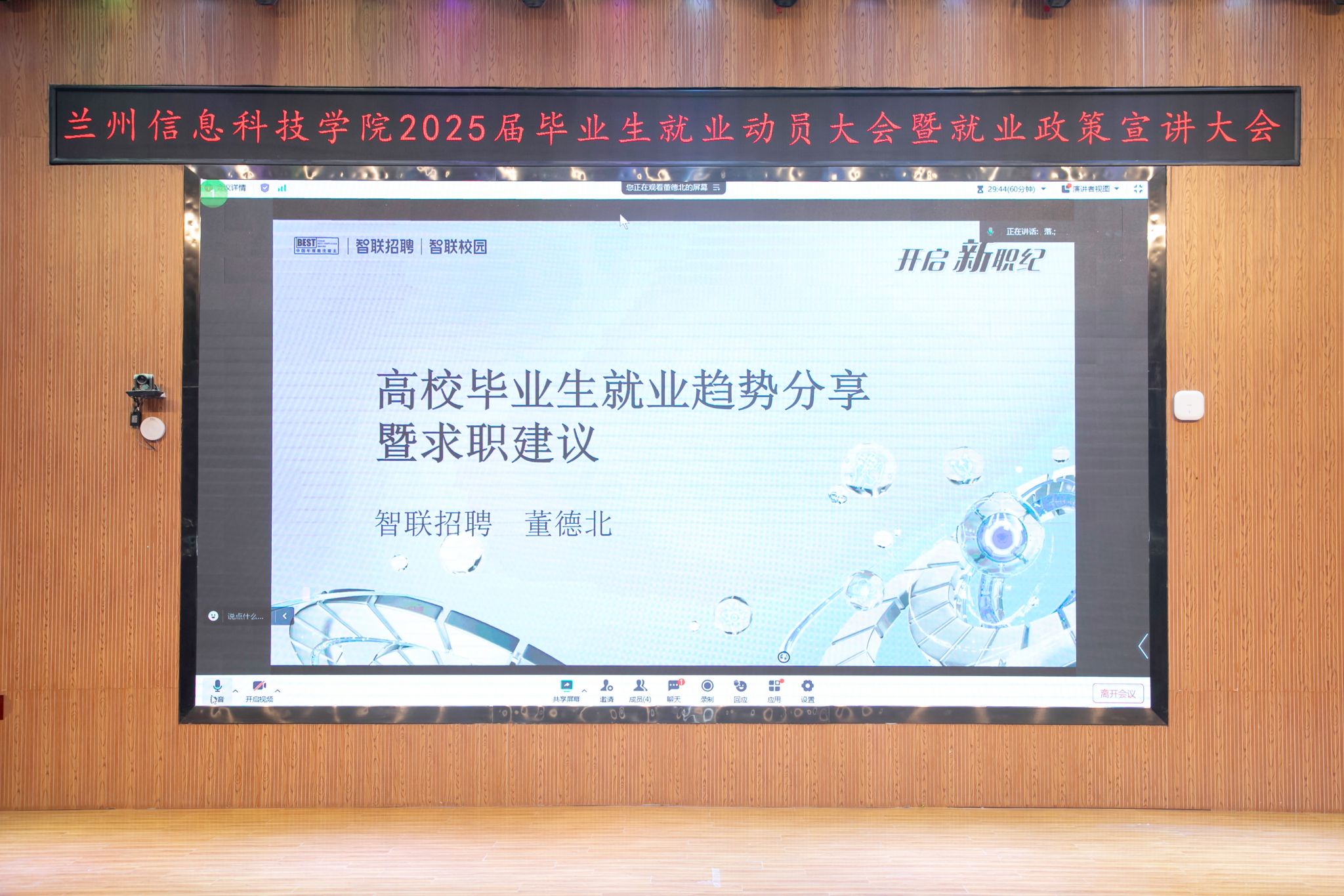 智联招聘校园及海外事业部西北区域负责人、金牌讲师董德北老师做就业形势与政策分析报告,用大数据向师生阐述了就业环境、就业结构、行业竞争、就业偏好、校招数据、企业需求等最新就业形势和现状,希望广大毕业生提前规划职业生涯,关注职业风向,积极适应市场变化,提升自身的就业竞争能力,做好就业准备,迎接挑战。