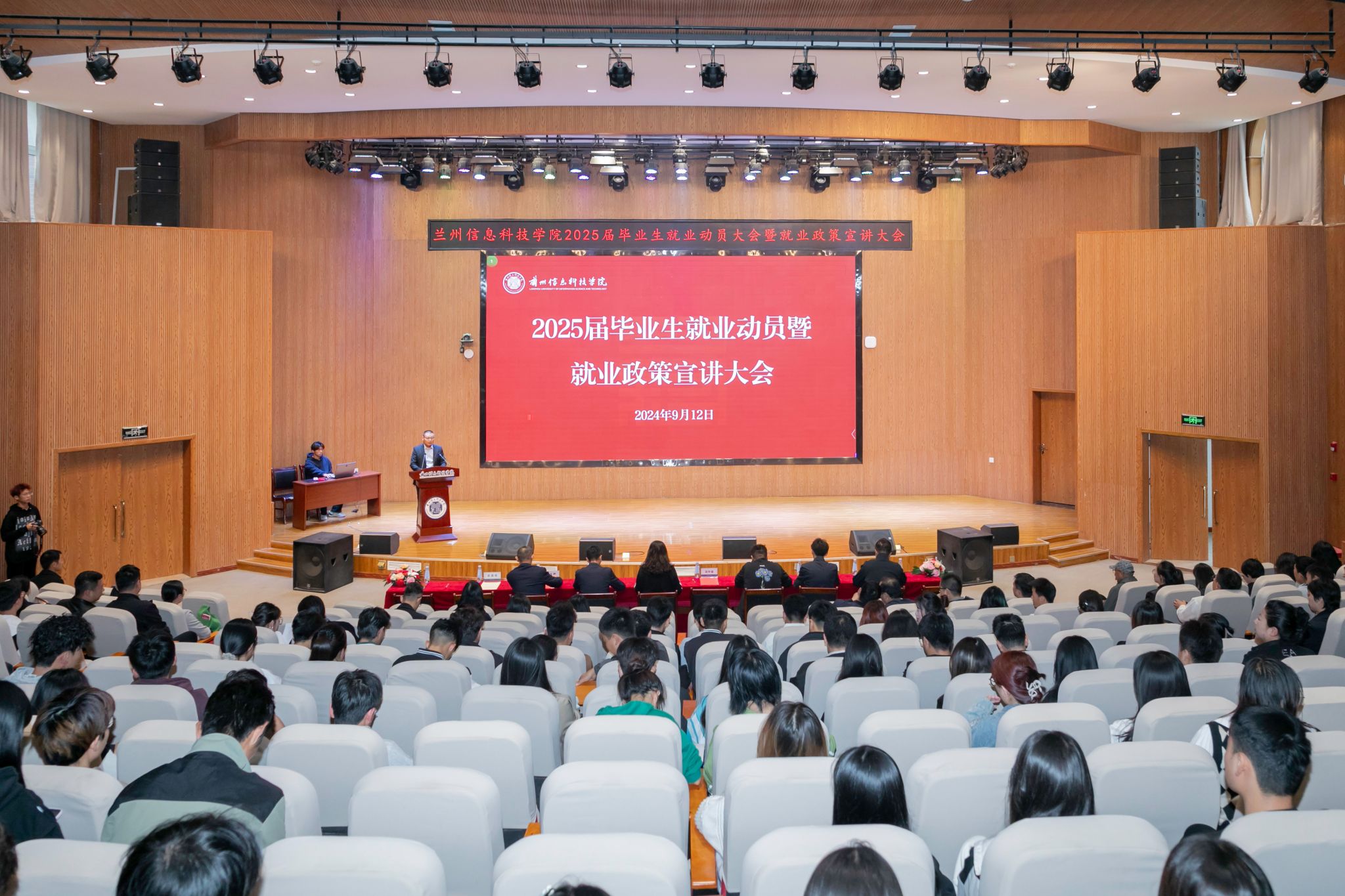 为贯彻落实党中央、国务院关于促进高校毕业生就业工作的决策部署及省委、省政府相关工作要求,进一步推进开元集团网站2025届毕业生就业工作高质量开展,9月12日,学校在二号报告厅举行2025届毕业生就业动员暨就业政策宣讲大会。党委书记周怀春,纪委书记、监事会主席周丽,校长助理朱明敏,校长助理李阳出席会议,各二级学院院长、学生发展中心主任、2025届毕业班辅导员、班主任,就业服务中心全体人员及毕业生代表参加,会议由就业服务中心主任袁英年主持。