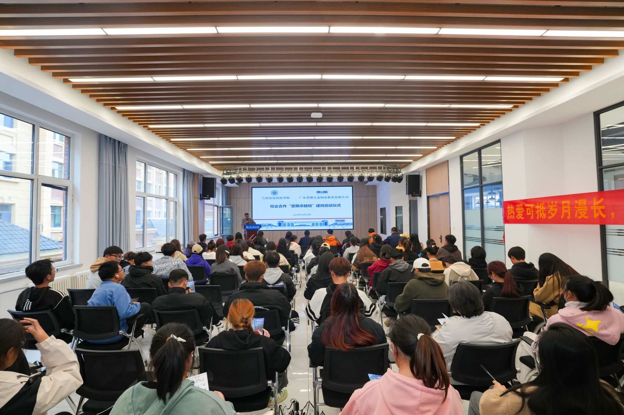 广东坚朗五金制品股份有限公司大甘肃销售区总经理齐笑介绍了公司的性质、经营范围、发展空间、行业地位等概况,并表示坚朗将提前参与人才的培养过程,从大二学员中开始组建班级,导入企业培训,让学员在校的理论知识能与企业实践教学有机结合,提前掌握社会就业实践能力,增强学员就业过程中的竞争力。同时,齐笑希望通过此次合作能实现校企双方的强强联合,共创共赢。