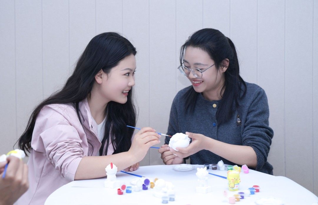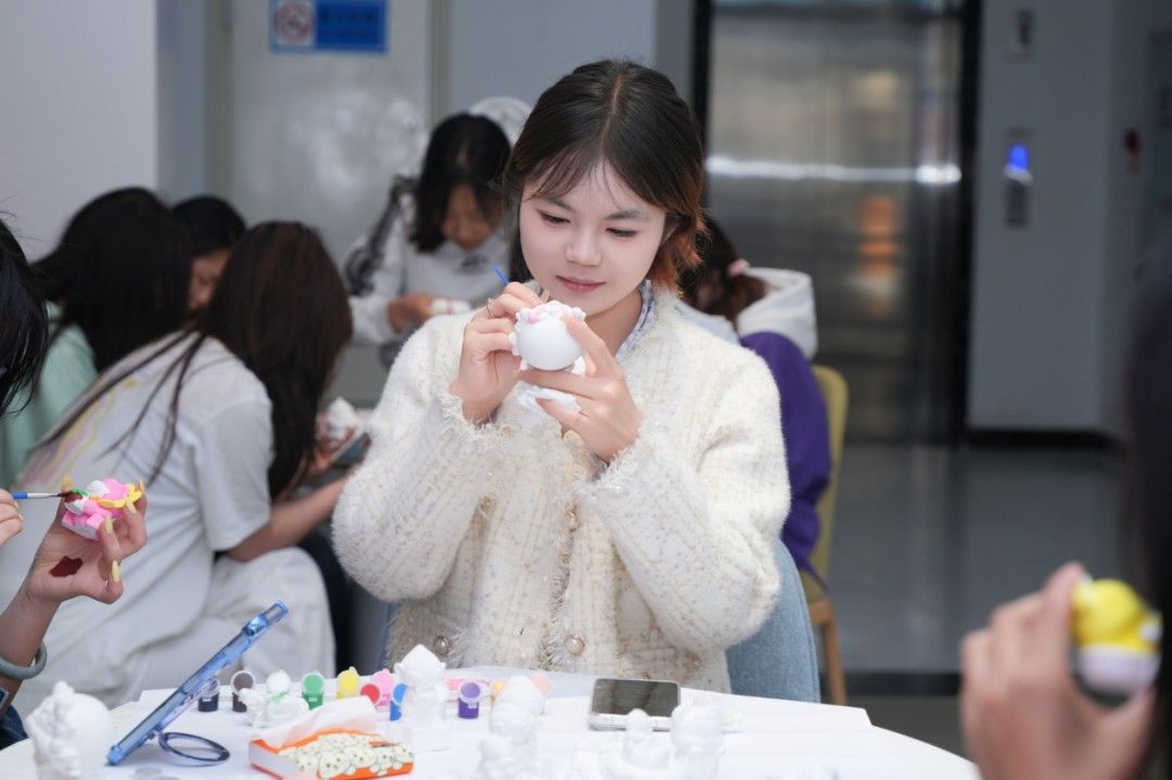 在公寓共享区的石膏娃娃工坊,同学们执笔画出专属自己独一无二的石膏娃娃,神情认真。这是基于艺术疗愈与积极心理学的理论基础,通过涂鸦与创作消散烦躁与焦虑,引导同学们学会用积极的方式调节情绪,在创作过程中与自己深度对话,挖掘潜藏情绪,完成一次温柔的自我疗愈。