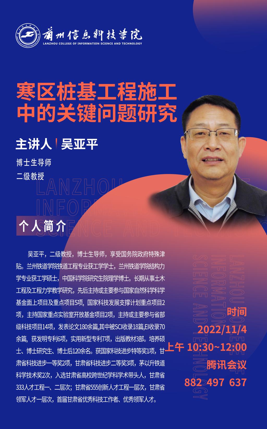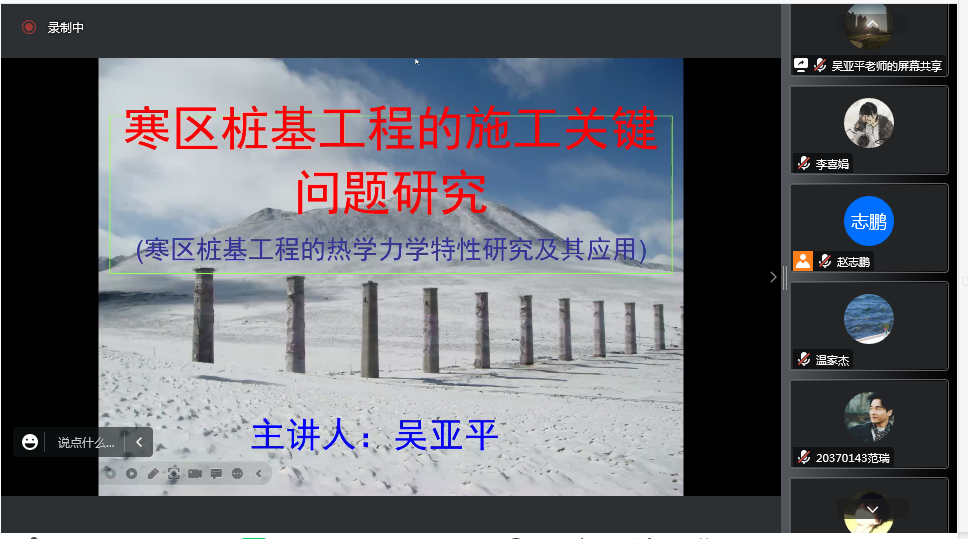 11月4日,兰州交通大学博士生导师吴亚平教授应邀为开元集团网站做题为《寒区桩基工程的施工关键问题研究》的学术讲座,学校土木工程学院全体师生以线上会议的方式聆听。