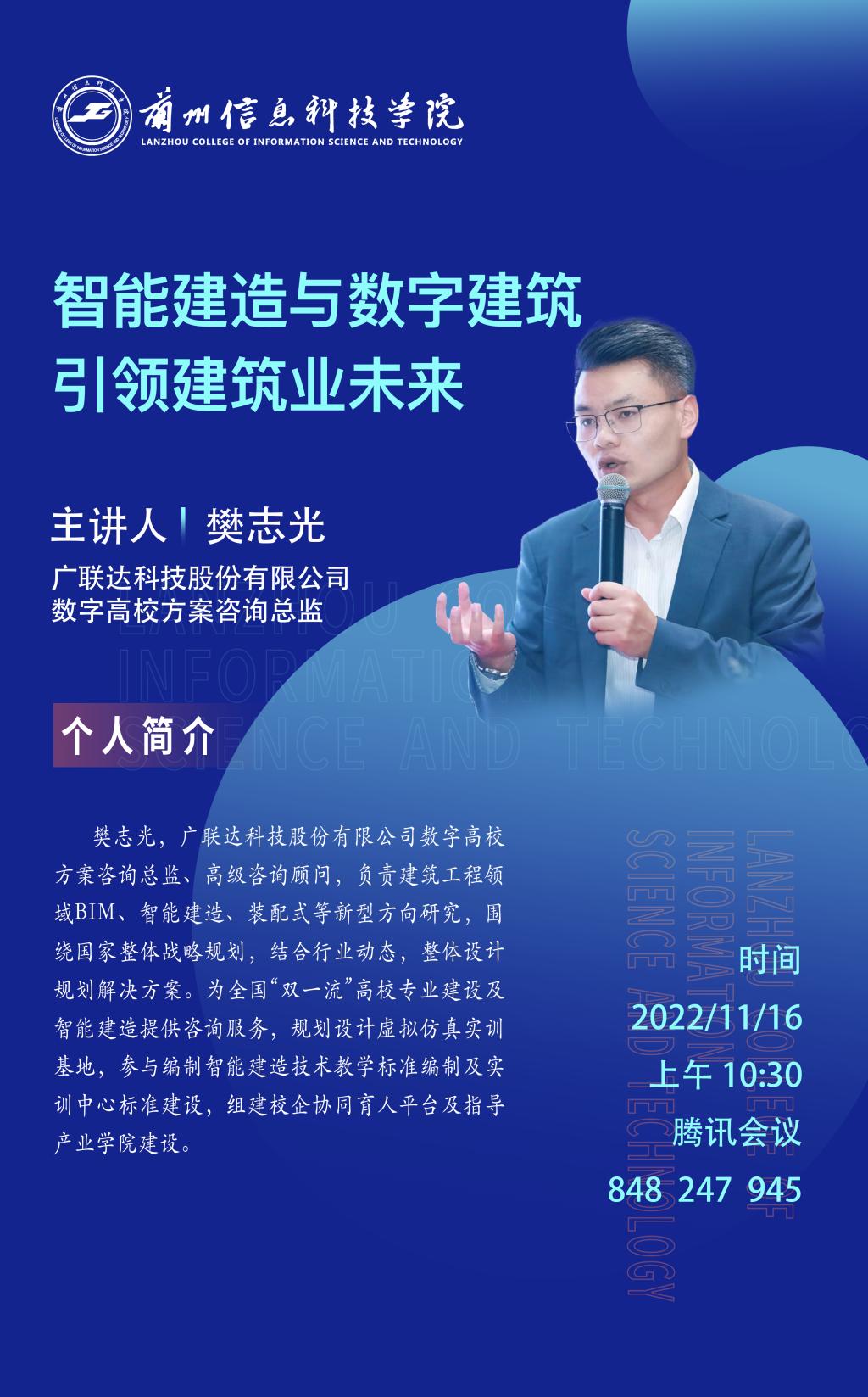 11月16日,开元集团网站土木工程学院邀请广联达科技股份有限公司的咨询总监、高级咨询顾问樊志光,以“智能建造与数字建筑引领建筑业未来”为主题,为学院学生开展了一堂生动的土建数字化、信息化专业前沿讲座。