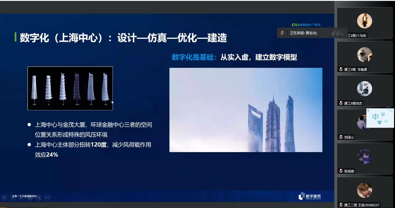樊志光从数字经济时代新特征、建筑产业发展新要求、智能建造与数字建筑引领新变革3个方面,结合行业发展现状为学生进行了深入浅出而又生动的介绍。讲座中提到,人类社会已步入数字经济新时代,数字化技术呈爆发式增长,建筑产业已进入数字化、信息化变转型升级关键期,而智能建筑就在产业数字化变革中应运而生。智能建造是以BIM、物联网、人工智能、云计算、大数据等技术为基础,主动适应企业需求的高度集成与协同的建造系统。BIM技术为智能建造提供了产品基础信息创造、集成、管理与服务的底层支撑;物联网技术为生产、物流与施工过程中的信息实时获取与传输提供了基础支持;人工智能则为智能建造各环节的智能分析与操作提供了有力保障。我国正处于传统建造向工业化、智能化建造迈进的重要窗口期,智能建造将颠覆建筑业的生产模式,极大提高建筑业的生产力,实现建筑业的转型升级。