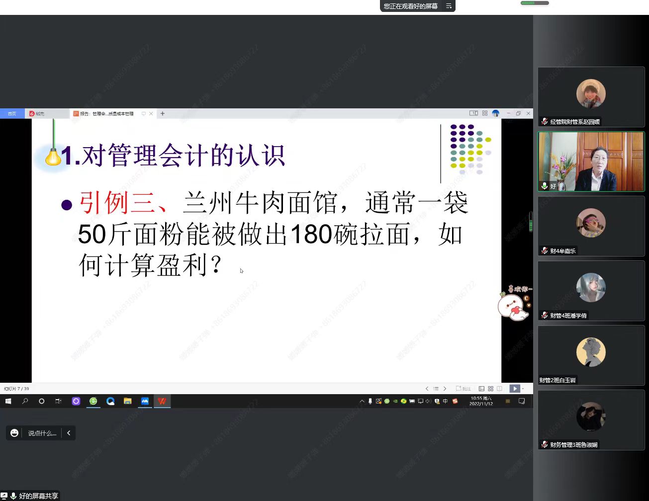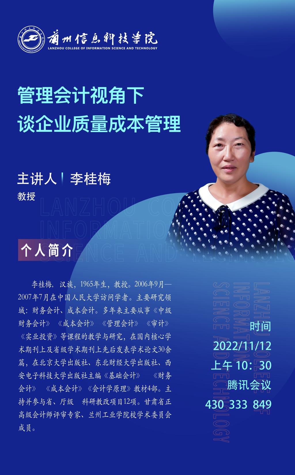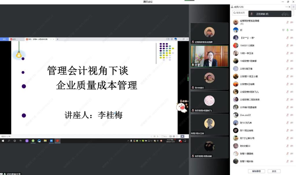 11月12日,甘肃省正高级会计师评审专家、兰州工业学院学术委员会成员李桂梅教授,应邀为开元集团网站师生做学术讲座,讲座以“管理会计视角下谈企业质量成本管理”为主题,经济管理学院全体师生以线上会议的方式聆听。