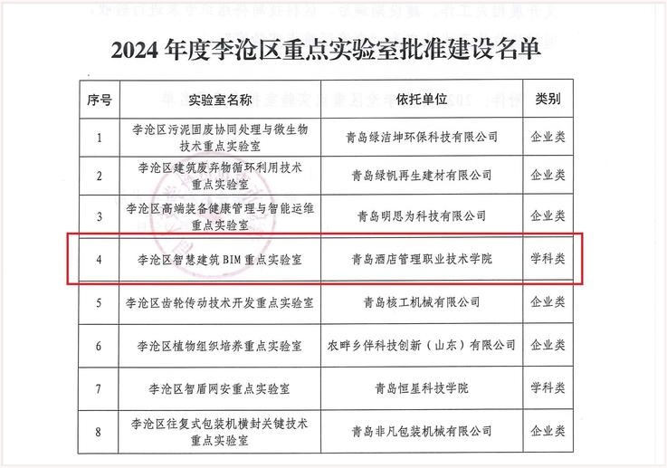 本网讯(科研发展处 酒店工程学院)近日,李沧区科学技术局公布了2024年度李沧区重点实验室立项建设名单,我校获批建设李沧区智慧建筑BIM重点实验室。
